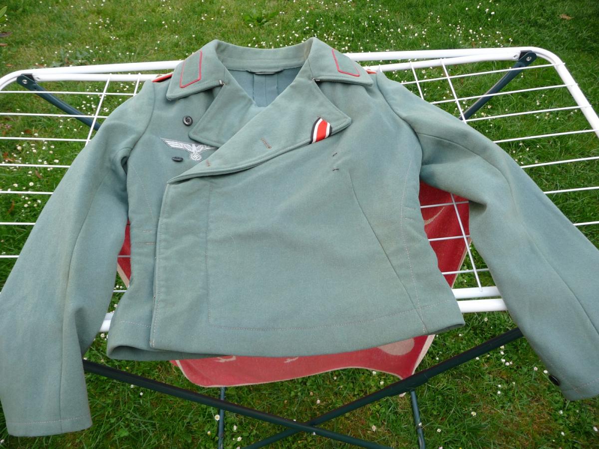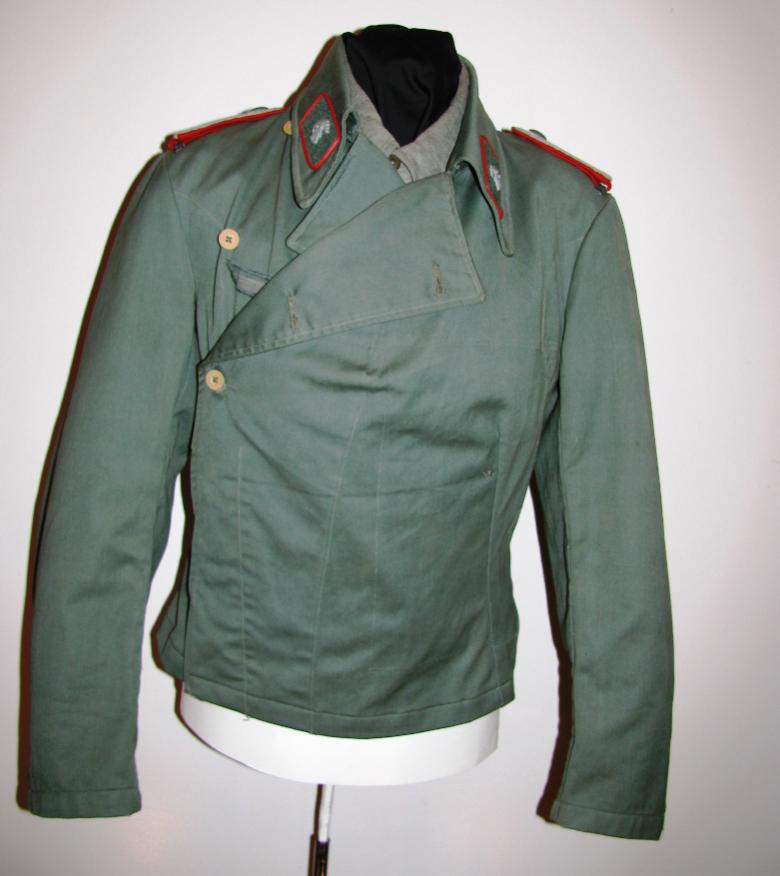 Мог быть такой оттенок при инд.пошиве из фельдграу трофейной голландской ткани. Или пошитый из серо-зеленой полицейской ткани.