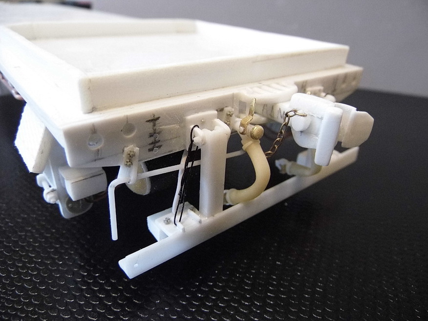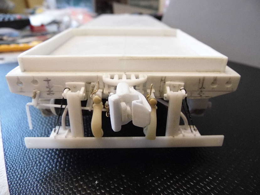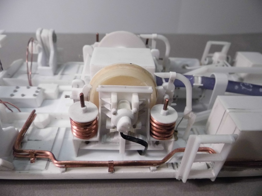 В работе использовал тамиевский пластик 0,3, 0,5, 1,2 и 2мм. Склеивал в разном сочетании для получения примерной масштабной толщины. Для стекол кабины тоже прозрачный пластик (PlaPlate) от Тамии 0,2мм. Колеса выливальсь из эпоксидной смолы. Резервуары - несколько витков пластика 0,3 на подходящем по диаметру предмте (напр. на ручке модельного резака), торцы лепил из двухкомпанентной шпатлевки от Тамии с последующей обработкой. Пружины из обычной проволоки из трансформатора (сейча ещё зазоры между некоторыми витками не отрегулированы). Корпус тонкой шариковой ручки вместо 2-х валов редукроров. Разные профили от Тамии - уголки, "н"-образный, "L"-образный, круглый от 1мм до 3-хмм. и др. Клепка и болты от Master Club. Изоляторы - металлические шайбы из строительного магазина в чередовании большего диаметра с меньшим. Будут ещё фары от Эльф белые и красные, причем белых в итоге около 8 штук. "Пол" на платформе будет ребристый (такой же как на боковых опорах). Делать его буду путем наклеивания на всю площадь полосок, которыми обвязаны например коробки от офисной бумаги. Цепочка от RB разного размера. Немного медной фольги, проводов. Рукава тормозной и напорной магистрали ещё предстоит сделать вместе с кранами, материал круглый пластик 2мм и кембрик. Изготовление пульта, приборов, кресел, ящиков, фигурок машиниста и помощьника, саму кабину и др. ещё впереди...