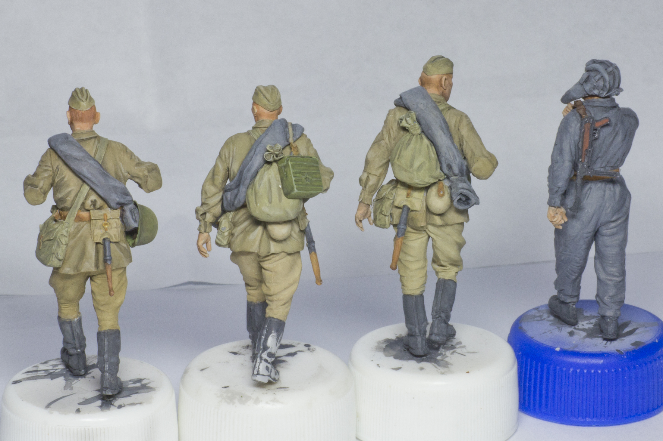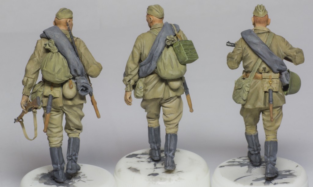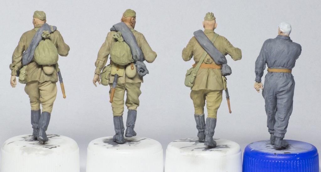 А добавите Вы туда вот эти, скажем так, достаточно посредственно покрашенные массово-тиражные фигурки, и сразу получится самая обычная диорама из разряда так всеми любимого штампа «Солдаты куда-то идут мимо подбитой техники».