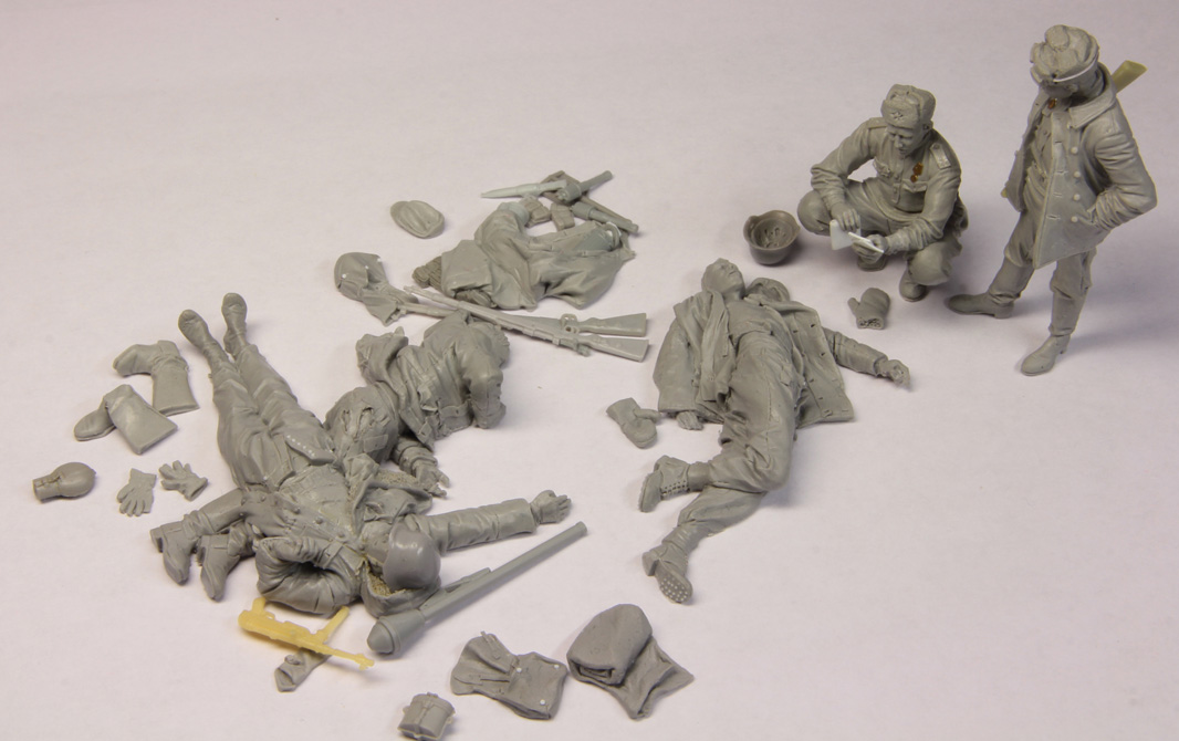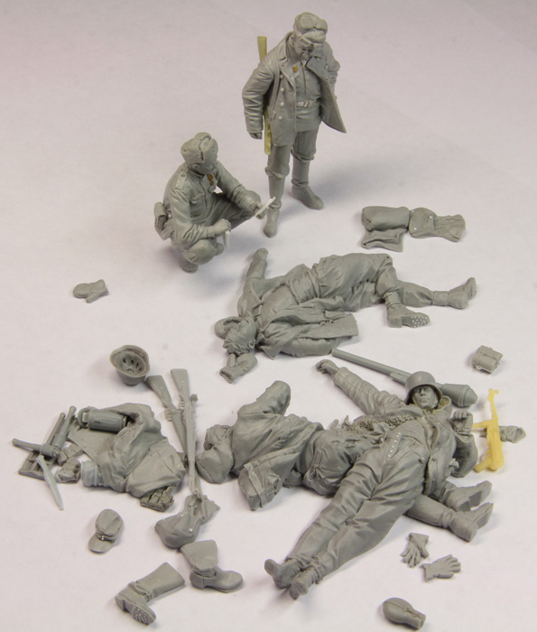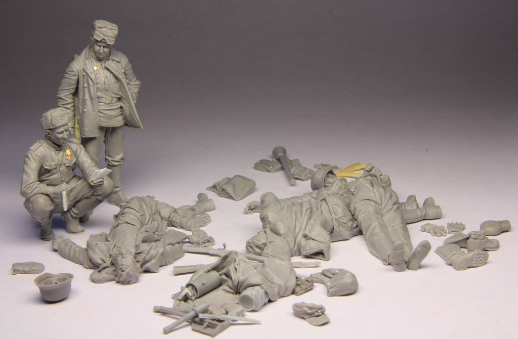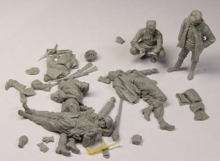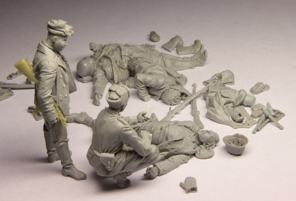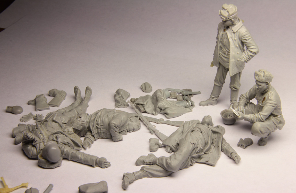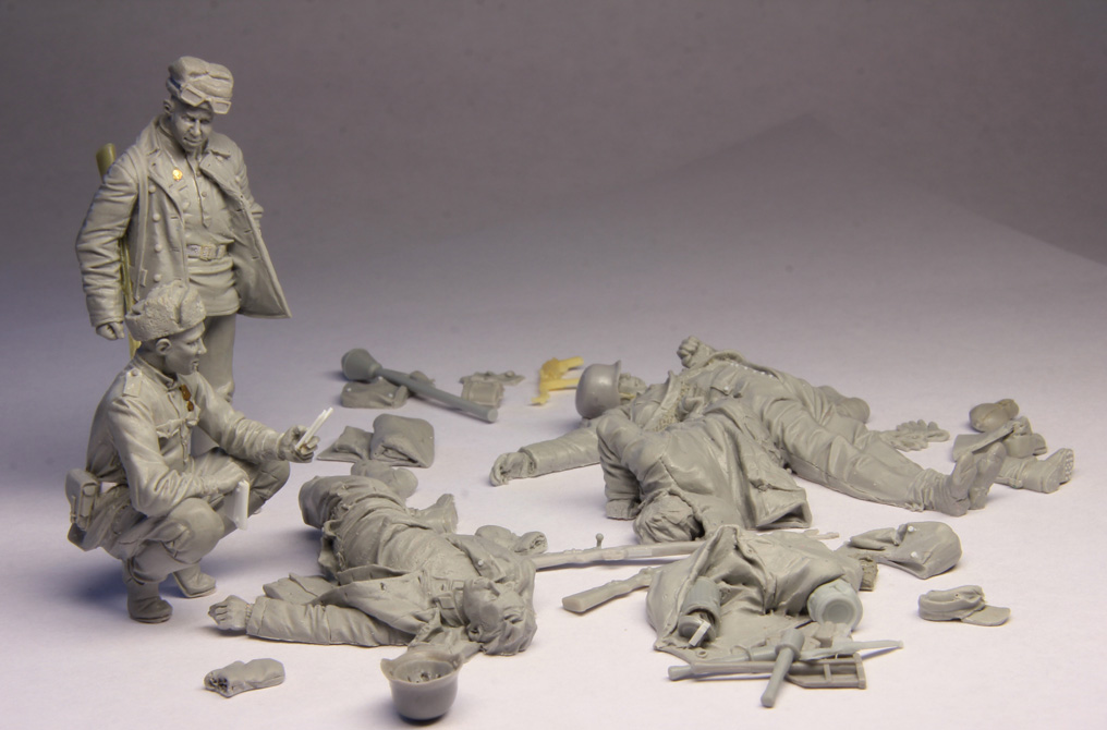 Давно хотел слепить мертвых немцев. Причем таких, расхабаренных, после шмона. Типичнейшая картина эпохи Второй мировой. Да и не только Второй мировой - на многих фотографиях с войны на Украине та же мрачная эстетика чувствуется. Прошло столько лет, а такие образы всплывают вновь и вновь. Чувствуется, так сказать, связь времен...