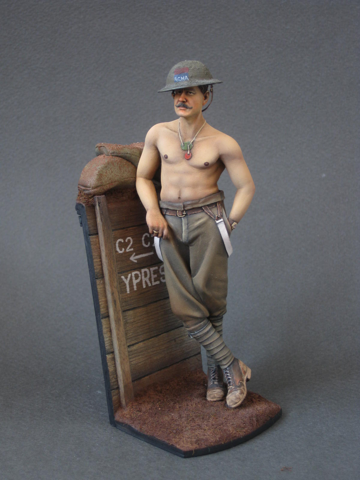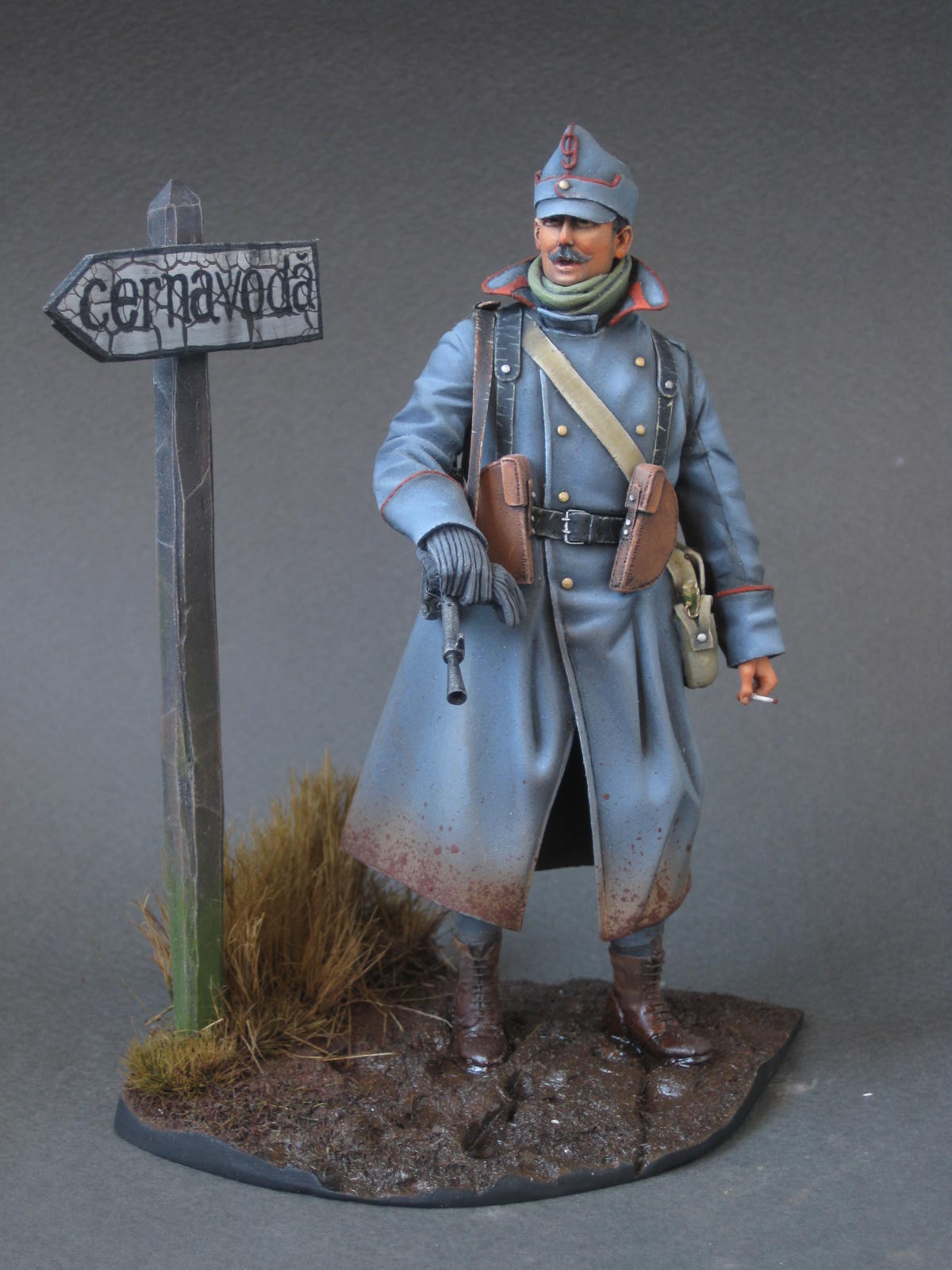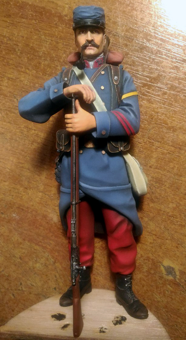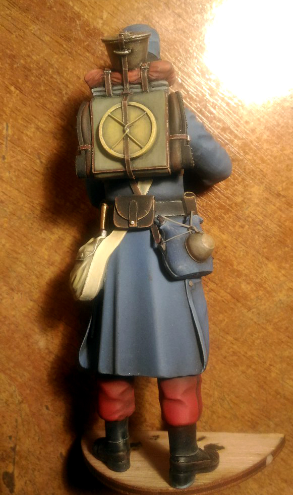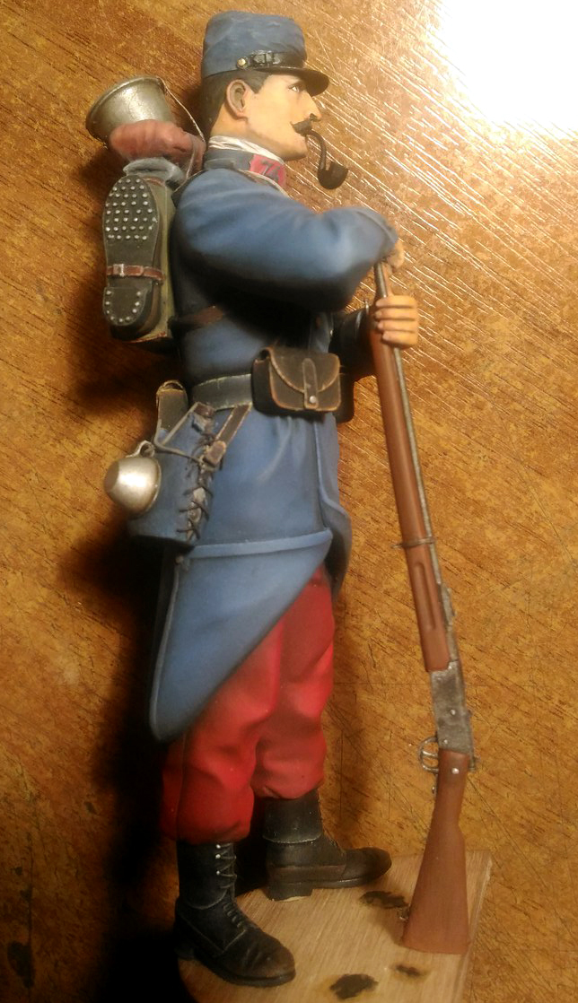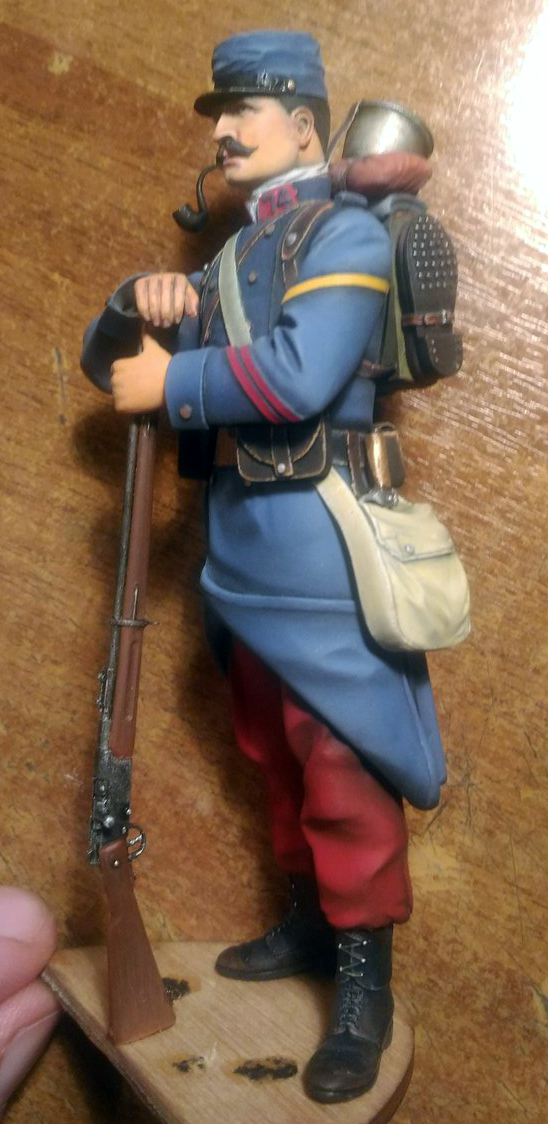 Пилю потихоньку дрова от верлинден,что бы хоть как то боец на человека стал похож.Были перелеплены штаны,ботинки,полы шинели и руки.Заново слеплен подвес для штыка,который в оригинале отлит одной деталью вместе со штыком и сухаркой.Полностью переделана фляга. Еще не закончен,предварительная сборка