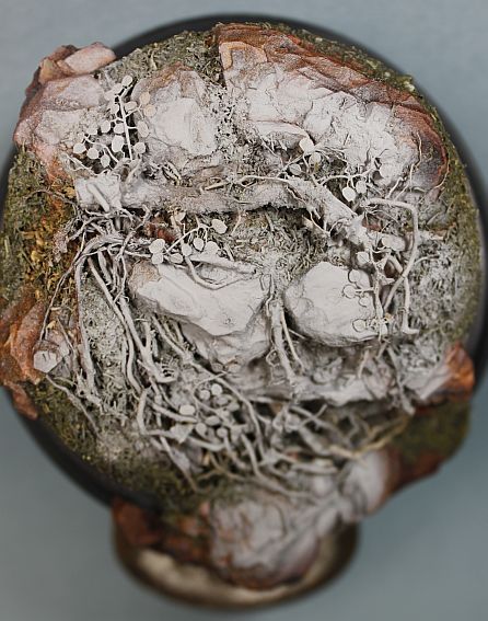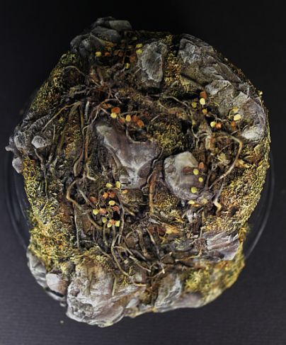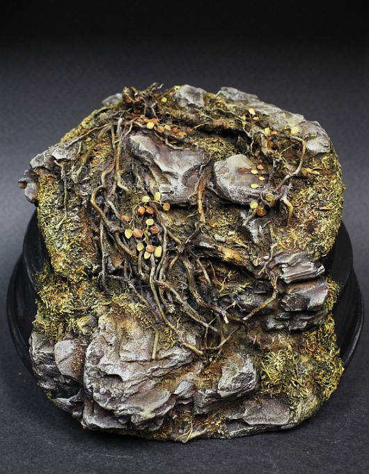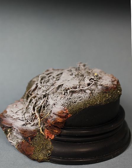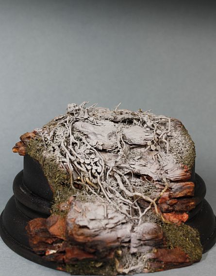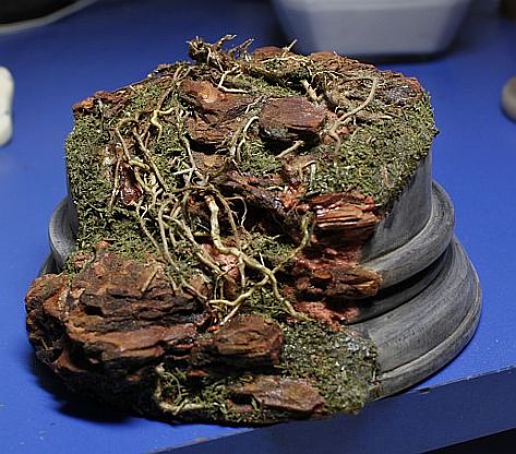 Давно уже заметила,что кора сосны сможет имтировать горные глыбы.Нанося глину и вставляя подрезанные к месту кусочки коры сформировала уклон,после высыхания залила суперклеем.Местами присыпая на клей укроп.Корни полыни для упавшего фрагмента дерева.Корни петуньи для имитации корней выбивающихся из под камней.Смотрится пока не очень,но лишнее можно всегда убрать.