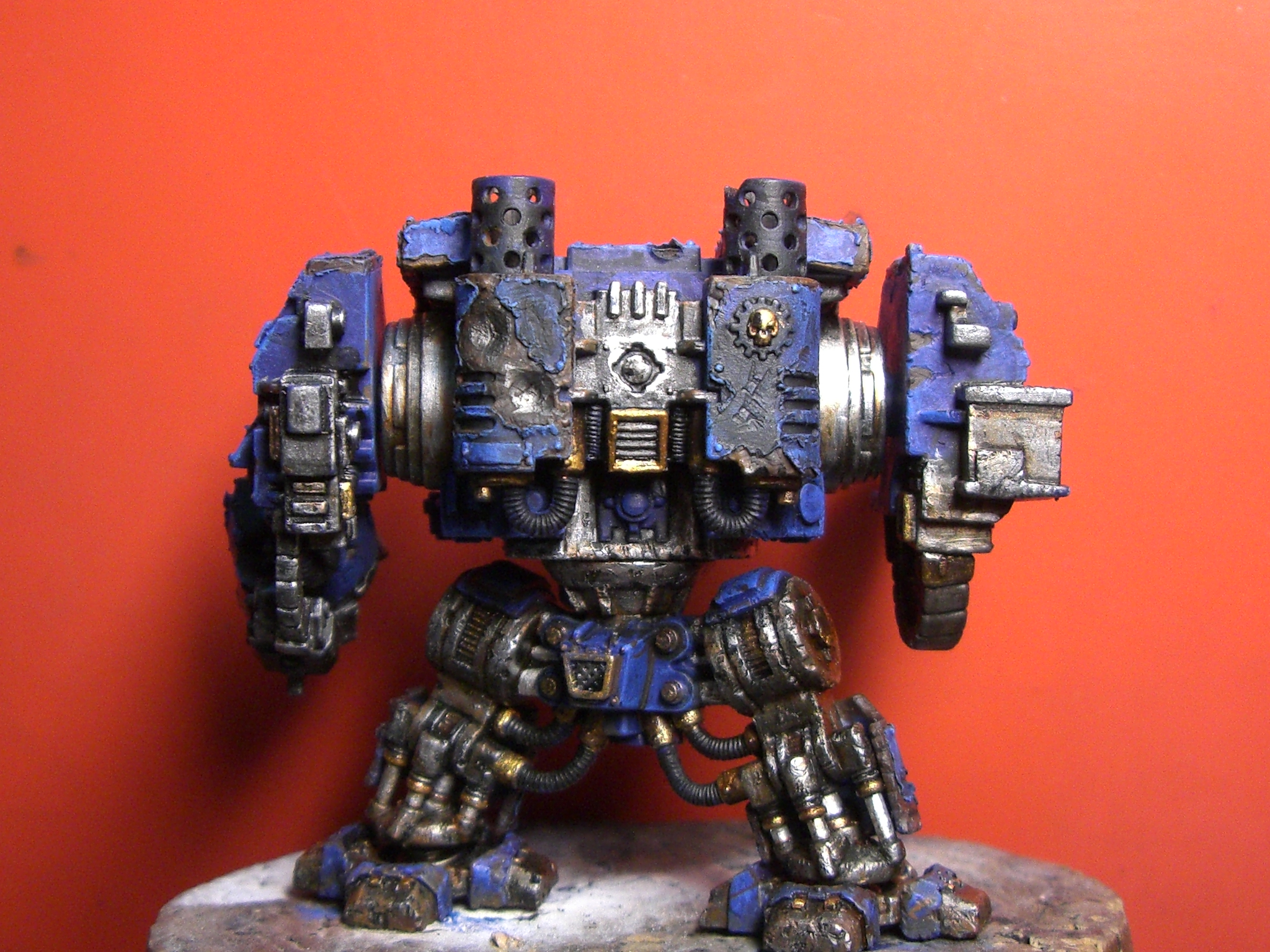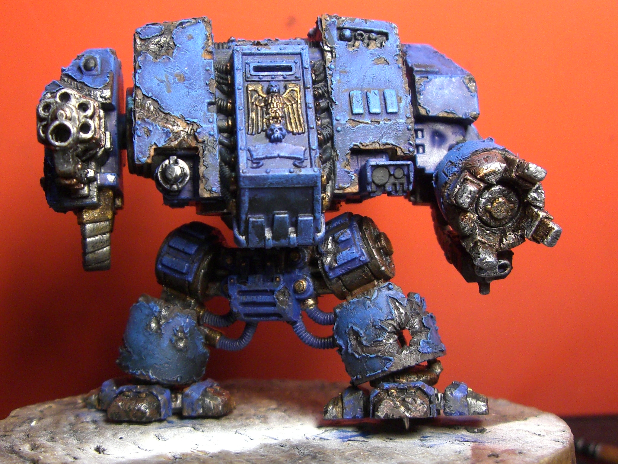 Очередной заказ на тему "Warhammer 40 000". Дредноут Ультромаров,и опять просьба сделать его древним,побывавшим во множестве боёв не одну тысячу лет.Работа ещё в процесе,основные цвета дал теперь затенять и подржавить надо.