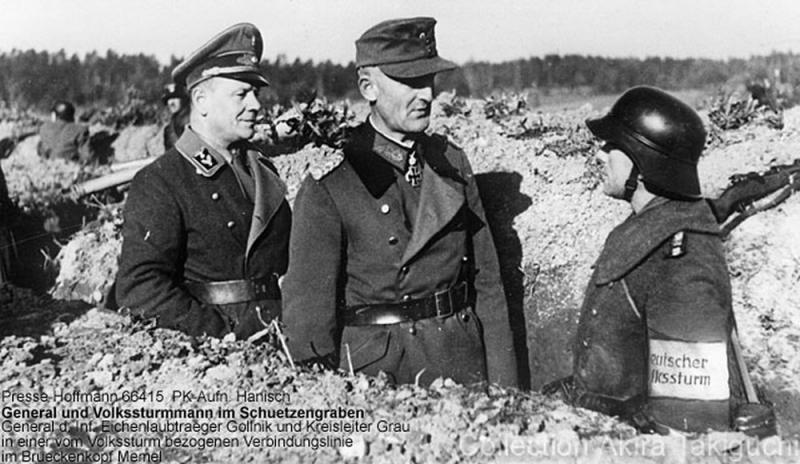 Надо заметить что часто Фольксштурм представляют как сброд дедов и пацанов вооруженных непонятно чем и одетых непонятно как. Такое впечатление может сложиться из фотографий немецкой пропаганды: когда в октябре 1944 года объявили о создании Фольксштурма, то пошла волна митингов, шумихи и проч. - вот тогда и нафотографировали этих дедков с Фаустпатронами. Но, в октябре 1944 территория собственно Рейха почти не была охвачена боевыми действиями и когда эти дедки вступали в бой много месяцев спустя, например, в апреле 1945, то у них, обычно, уже была и шинель и MG42 и выглядели они уже как солдаты. Конечно, факт участия в боях гитлерюгидцев в черной форме и дедов в гражданском и в форме всяких гражданских служб неоспорим - есть фото пленных, но всё же образ Фолькстурма в бою ближе к обычному Вермахту.