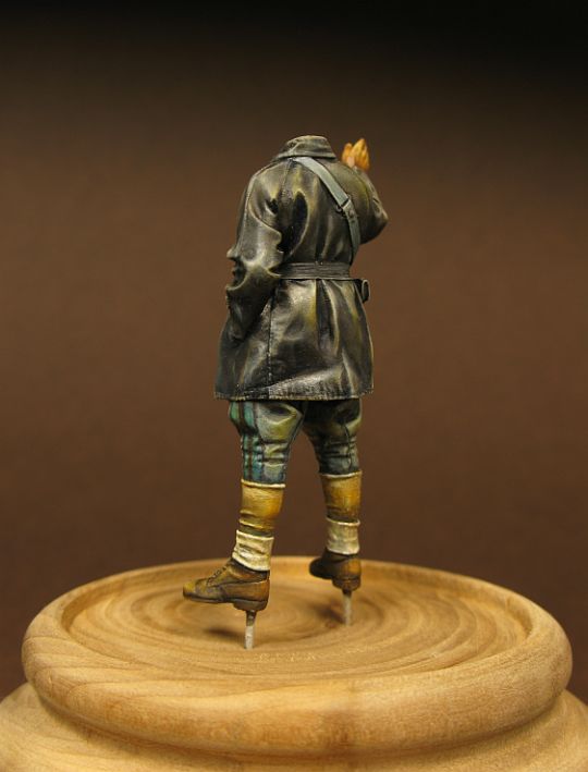 Ещё один пример,безупречной фигурки от Алпайн.Боялась эксперементов с кожананкой.Нарисовав "на сухую" светлые блики,после высыхания-лессировки сильно разведённым маслом.Окрашенная голова в шлеме утрачена.Хорошо,что в наборе по две.