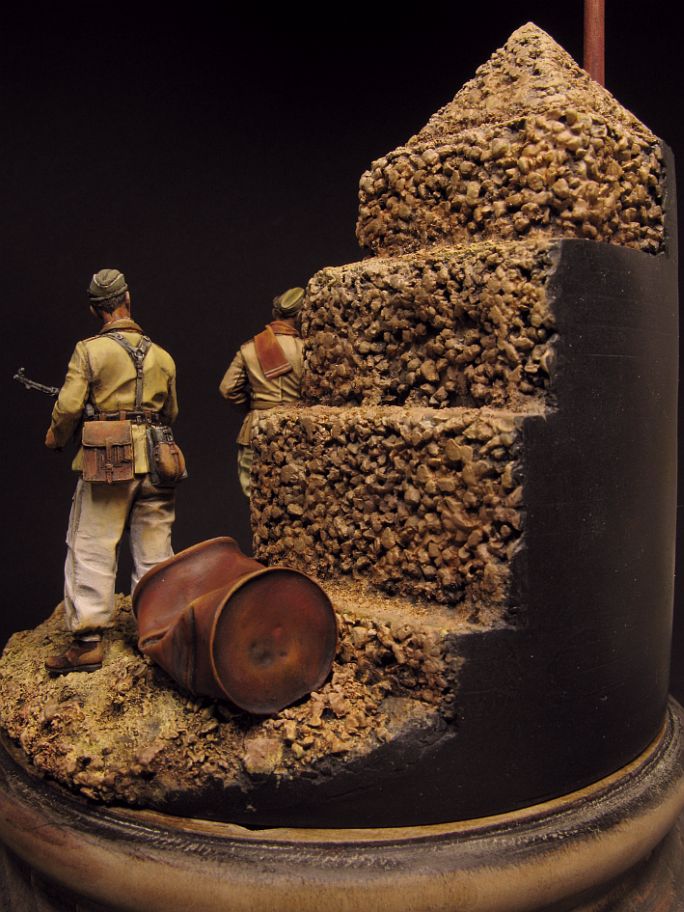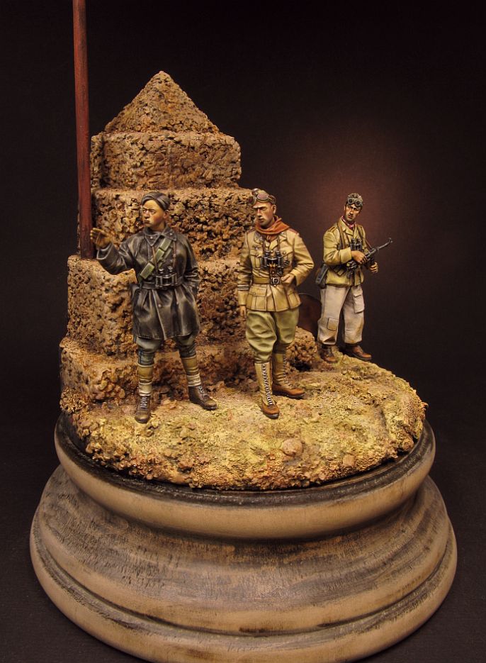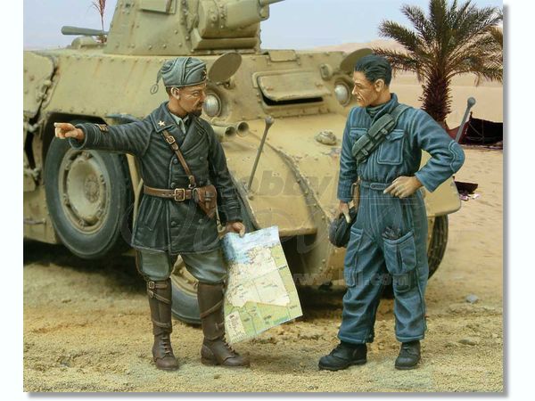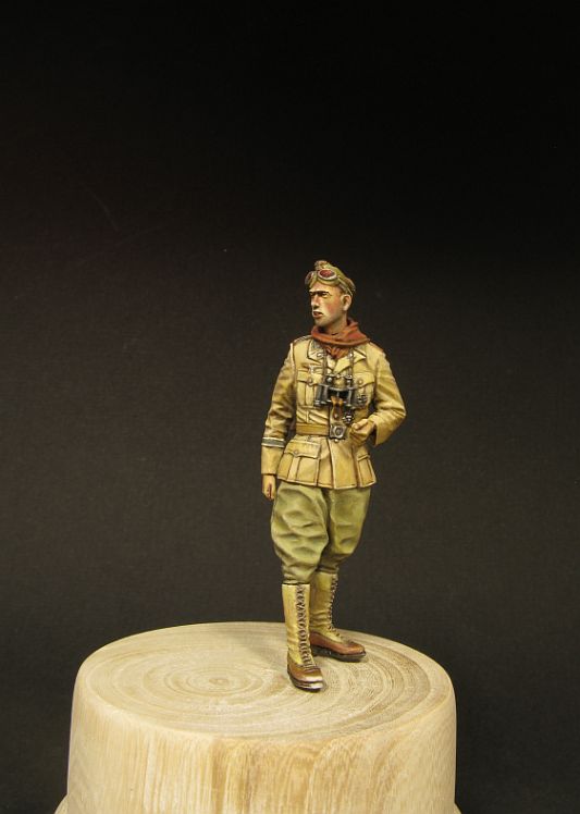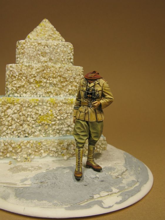 Так представляется цвет патронташей (такие носили танкисты, артиллеристы и мотоциклисты). Обратите внимание на серебряные звезды Савойской династии на воротнике. Кобура под удачную и популярную Беретту мод. 1934 могла быть и черной. Здесь командир в обычной серо-зеленой пилотке-бустине, в Африке смешение тропических и европейских элементов у итальянцев было обычным делом. Удачи.