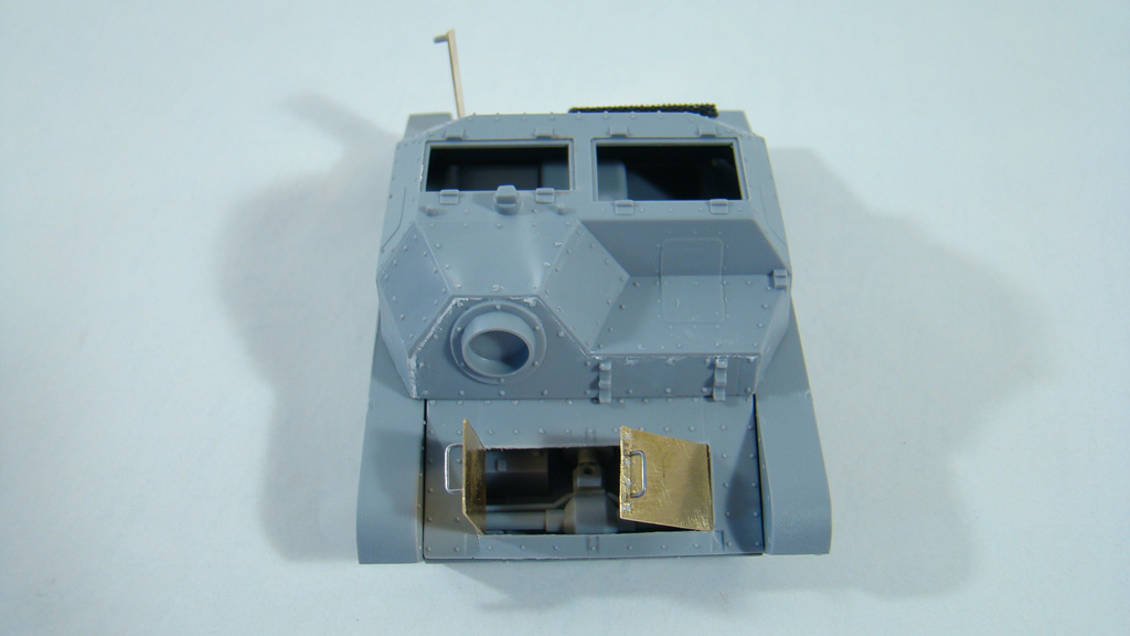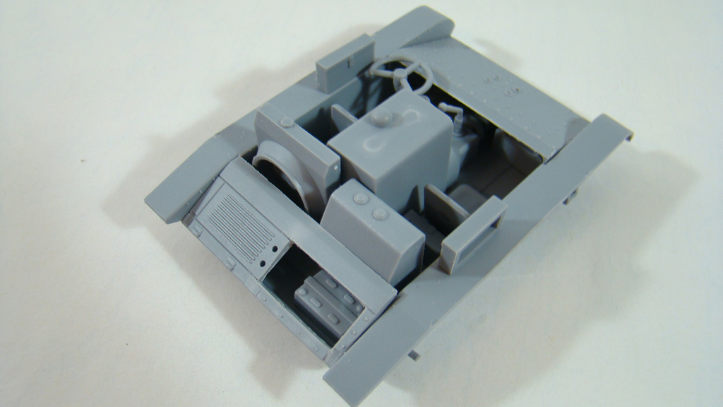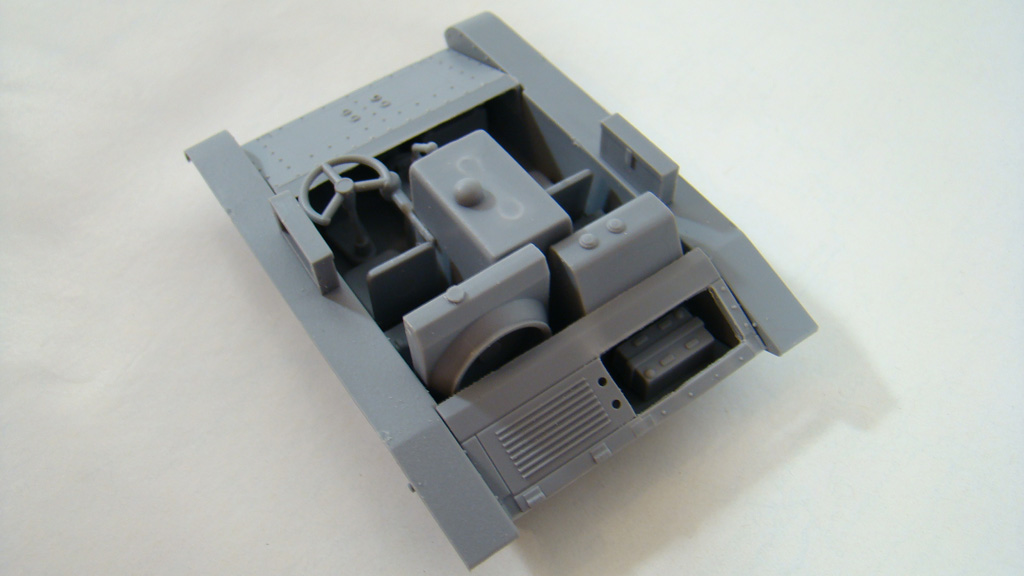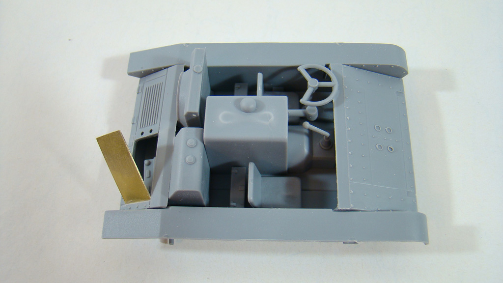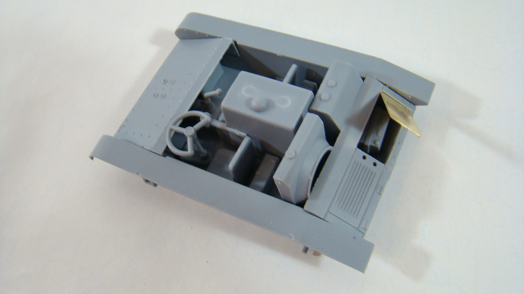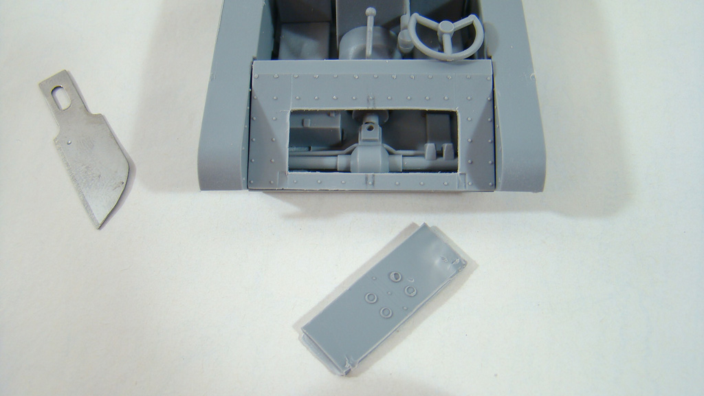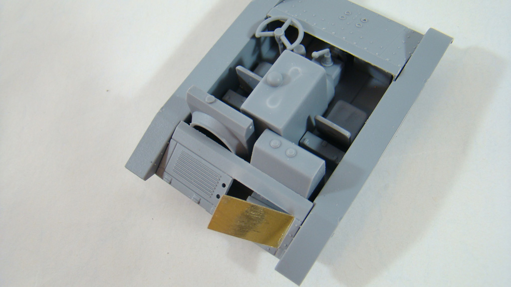 Створка вырезана и обточена, будет примерно так..в конце можно будет добавить еще кучу проводков ...которые в изобилии встречаются на фото разбитых танкеток.да и спартанское исполнение интерьера это частично спрячет..