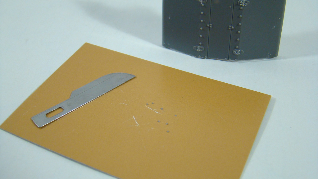 Там на правой створки был небольшой порог,его воспроизвел наложением более тонкого железа и проставил клеп, которые срезал с ходовой макетовской праги.Дальше все заклепки так же идут с этого набора.