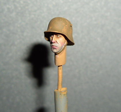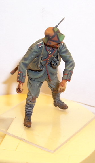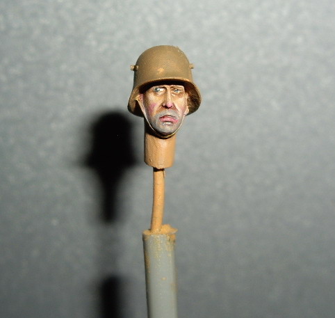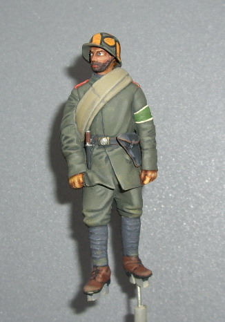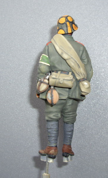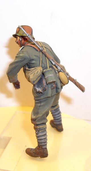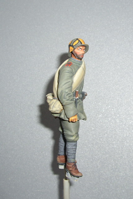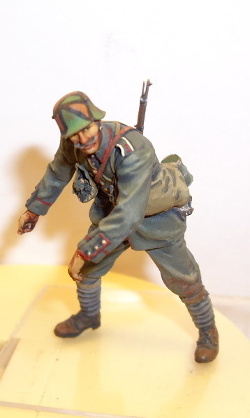 Этот нравится больше - у него мягкие переходы в складках и хорошая фактура френча, отменная повязка, фляги и скатка. Лицо бы еще помучить, и сузить глаза - выделяются великоватыми белками. Акрил хорош тем, что без опаски можно "смягчать" переходы очень жидко разведенной краской - почти грязным растворителем. А заодно и блеск в ненужных местах снимает.