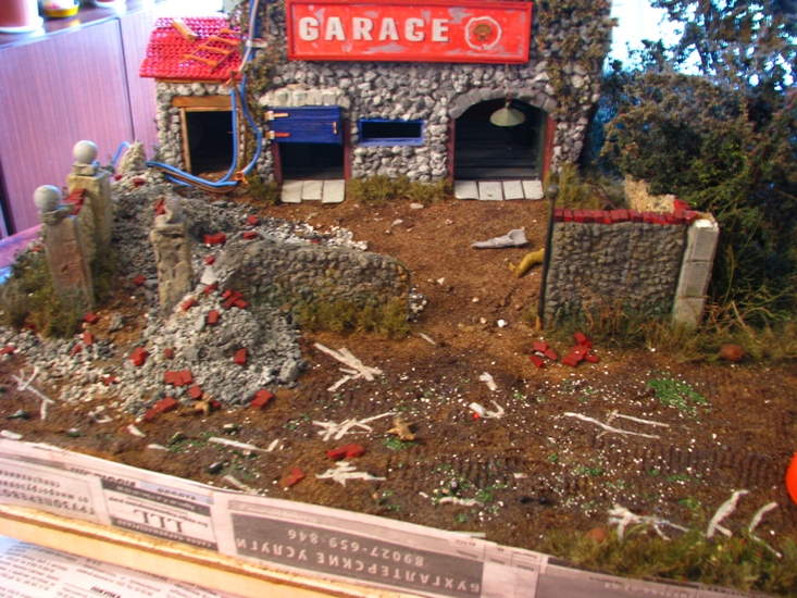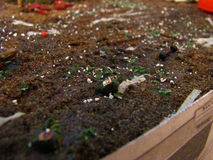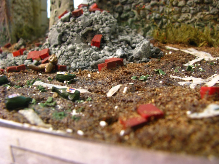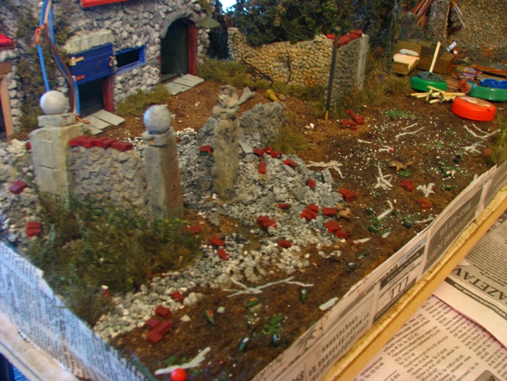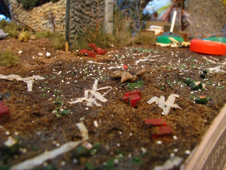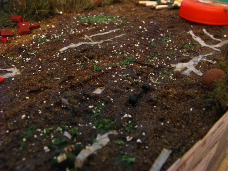 на дороге разместил битые и пустые винные бутылки. осколки стекла.бинты. игрушки. на медведей пока внимания не обращайте они в процессе окраски. бутылки копии бутылки из набора Европа с америкосами. битое стекло яичная скорлупа. бинты туалетная бумага. игрушки вылеплены из пластики.