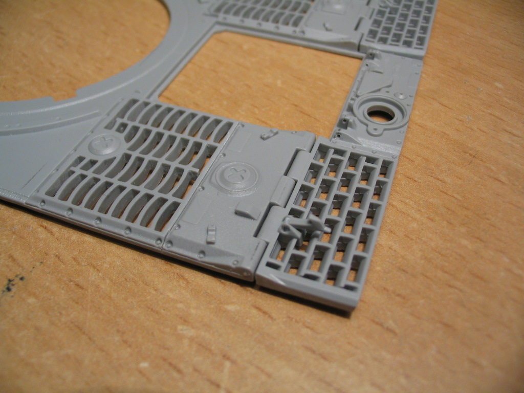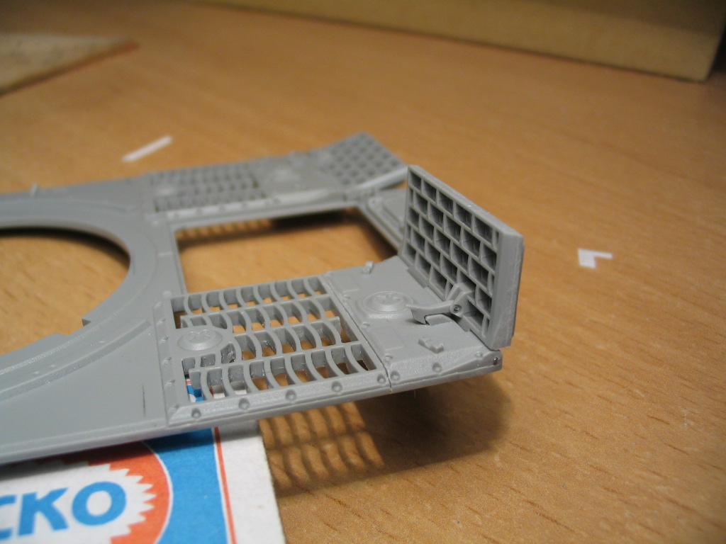 Задние решётки над вентиляторами Драгон даёт максимально копийно, все другие фирмы дают только её верхнию часть. Поэтому мне было жалко скрывать такую красотищу и я решил сделать их рабочими. Для этого просверлил отверстие 0,5мм вставил палец из стальной проволоки, а также доработал фиксатор до правильнои формы. Теперь решётку можно зафиксировать в открытом состоянии.