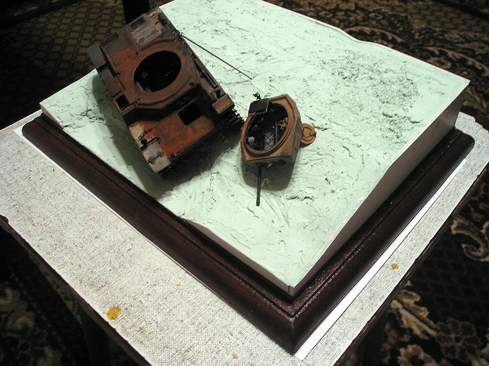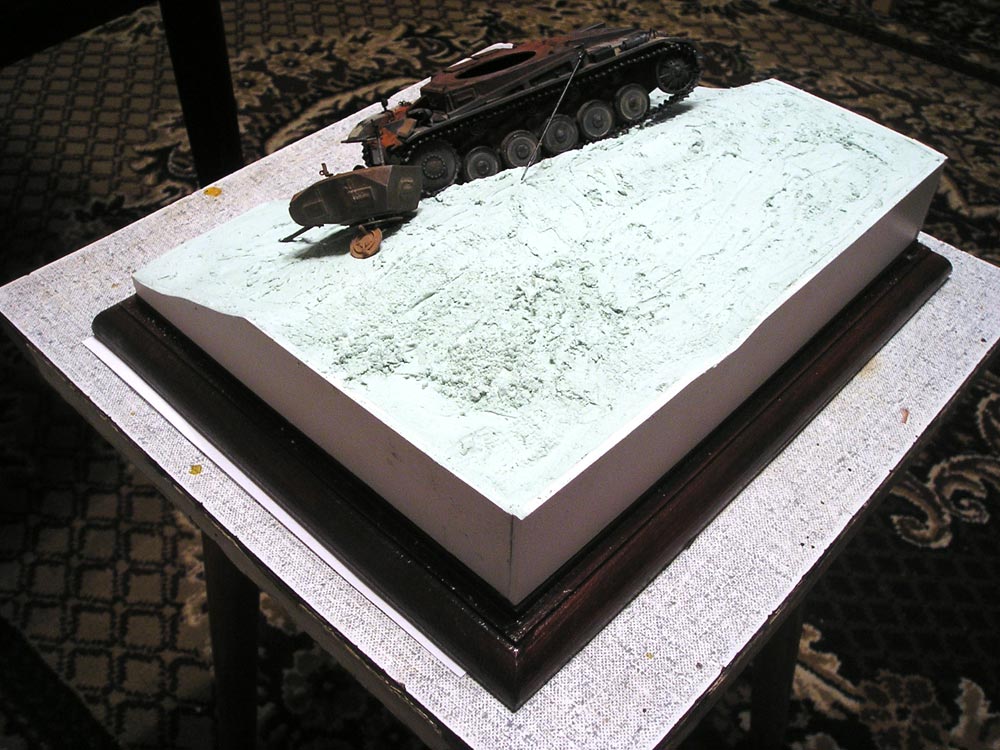 Вот примерка "двойки" по-месту на новом основании. Базовый грунт застыл, остается доделать Т-34 и поместить в "финальную" грунтовую дорогу (следы, мелочевка, брошеная экипировка и т.п.)