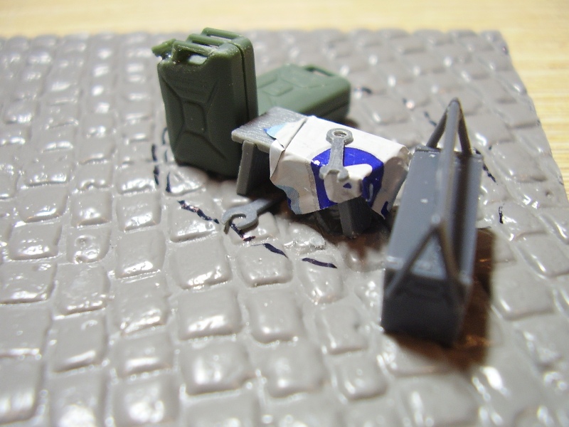 А не тесно ли на модели на таком основании?Фонарь зажат.Может развернуть модель и у фонаря сложить инструменты.А канистры с чем?Если с водой то и одной хватит,а если с топливом или пустые-чего их экипаж раскидал.Прошу не обижаться на мои комментарии.Модель на основании не просто набор элементов.Очень важна смысловая нагрузка.Почему так,а не иначе.У зрителя не должен возникать такой вопрос.Попробуйте разные варианты.Уверен вам самому понравиться искать возможные комбинации.С интересом буду наблюдать за дальнейшей работой. С уважением.