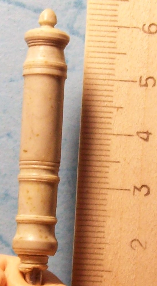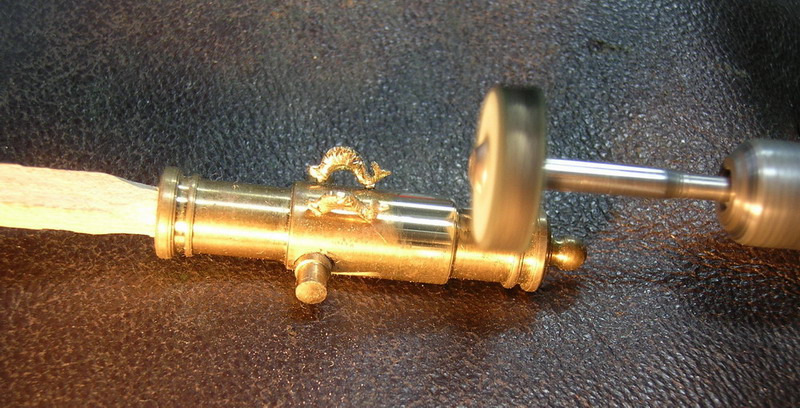Прошу прощения за то-что вклиниваюсь в Вашу тему.Когда у меня встала таже проблема-как выточить ствол-тоже пробовал точить из бронзы.Из достоинств-монолитный кусок бронзы-натурель так сказать.Из недостатков-необходимо наличие ювелирного токарного станка и ооочень большой опыт работы на нем.Про резцы стеклодиски и прочее-вообще молчу.Вопрос решил следующим образом.Взял обломок бура соответствующий деаметру отверстия ствола.Из меджик скальпи налепил на него колбаску.Когда эта конструкция застыла-зажал в бормашину.Наверняка у каждого есть самодельная из сервопривода.Далее резцы.Ножницами вырезал их из обычного лезвия.Даете вращение и намечаете по чертежу размеры.Дальше легко и просто все точится.для нанесения продольных полос использовал торцевую кромку обычной писчей бумаги.Ее же использовал для шлифовки изделия.После того-как изделие готово-нагреваете немного в духовке и снимаете с оси.Дельфины и цапфы долепливаюся.Достоинство этого способа в том-что он позволяет долепить на орудия гербы надписи и прочие украшения.Разумеется этот способ-для последующего тиражирования.Таким способом для First Legion была сделана французская пушка в 1-30, 40мм и две австрийские масштабе 1-30.Существует также несложная технология бронзирования оловянных пушек при которой она практически неотличима от выточенной из бронзы.Вот заготовка полупудового единорога 40мм.Как видите технология позволяет обод орудия не упрощать а выполнить с тройным перепадом в размере.