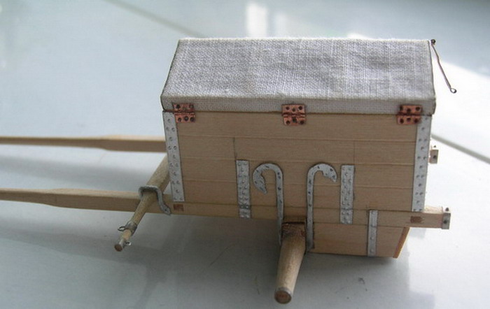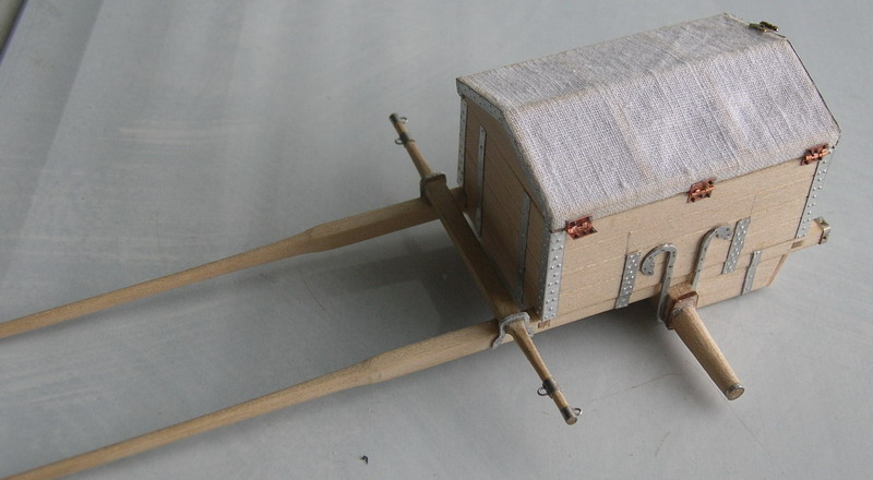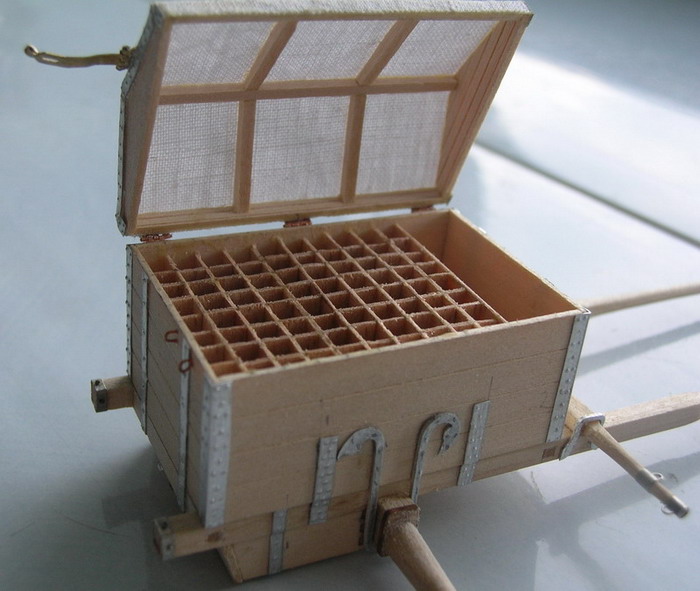 Теперь немного о зарядном ящике. По легенде, его конструкцию придумал сам Пётр.Ящик сделан для 3 фунт. полковой пушки.Он оглобельный. Запрягалось три лошади. Рама деревянная, перх парусиновый. Вначале верх сделал из белой ткани. Но уже перед покраской понял, что грубовато выглядит. Заменил его на изготовленный из проклееной гигиеническй салфетки "Zeva".