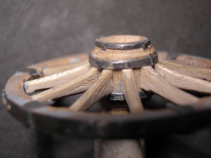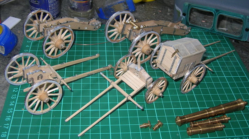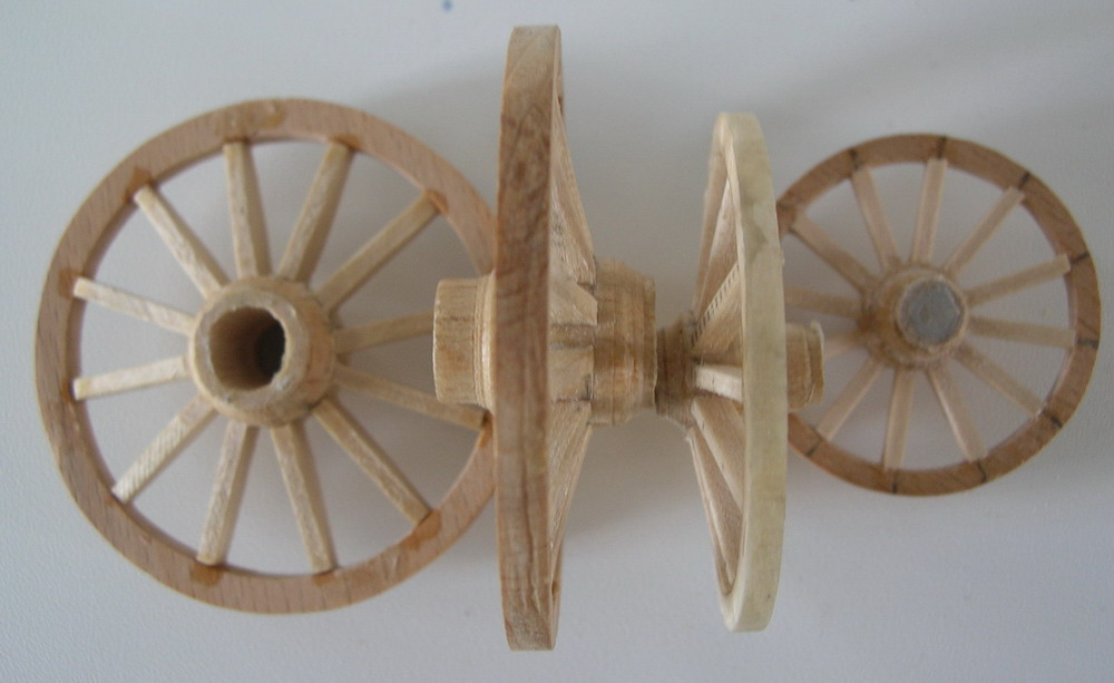 Последнее по мелочам. Сверлю отверстия в осях под чеки.Делаю сами чеки, ставлю колёса. Арсенал готов к покраске. Перед покраской колёса снимаю.