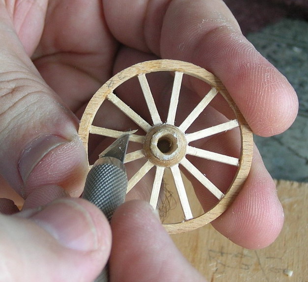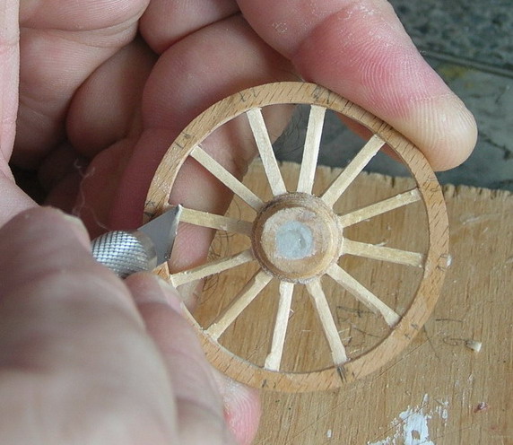 А теперь самое нудное дело (в данном случае).Изготовление колёс на все модельки.Так как я разобрал своё приспособление для сборки подобных колёс в сязи с изготовлением нового, то делать стал по упрощённой технологии. Рапспечатал колеса со спицами. Эти разметки приклеил на пластину полистирола.В центр разметки вклемл ступицы выточенные на токарном станке. Ободы выпилил лобзиком из буковой линейки.Для того, чтобы вставить спицы под углом, по кругу приклеил бруски высотой соответствющие вылету спиц.Напилил брусочкоы под спицы. А далее, обрезаешь под углом края спицы и вклевиаешь по разметке. Это самый простой способ. Второй способ. Подогнав спицу, с обех концов в высверленные отверстия вклеиваешь шипы высотой 0,5 мм. На ступице и ободе предварительно тоже высверлены отверстия. Вклеиваешь спицы. При третьем варианте, в ступице сразу сверлятся отверстия, в нижнем крае спицы тоже, а вот в верхнеи крае и ободе после установки спицы. И тогда же вставлять шип.