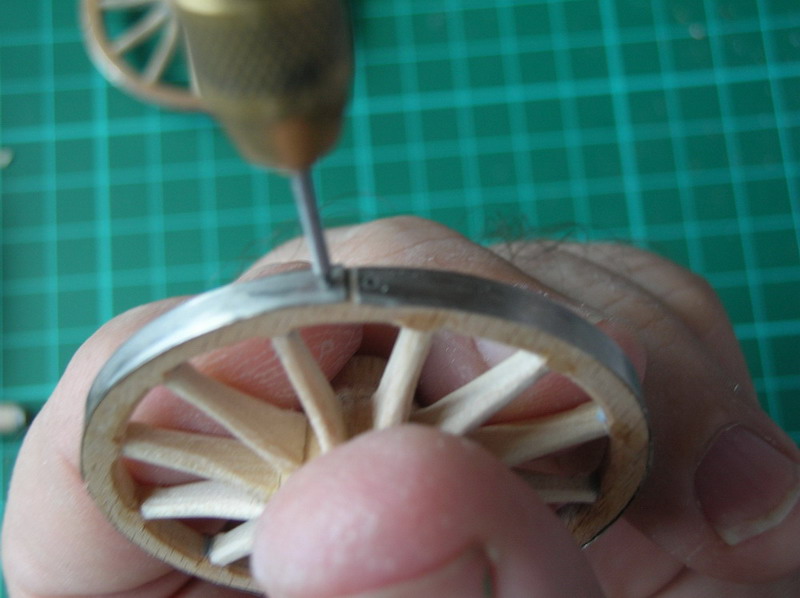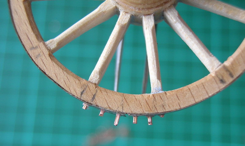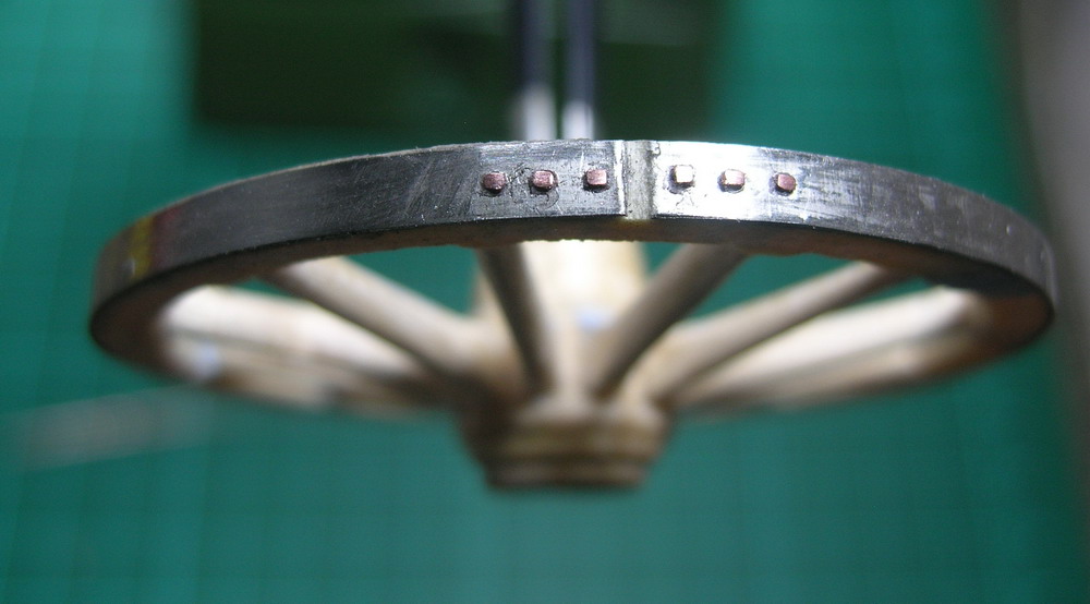 Приклеиваю по три шины на каждое колесо. Из никелевой фольги. У каждого края шины сверлю по три отверстия под шинные гвозди. Проковываю медную проволоку, вставляю на клей в от верстие и откусываю.Надфилем формирую шляпки гвоздей.