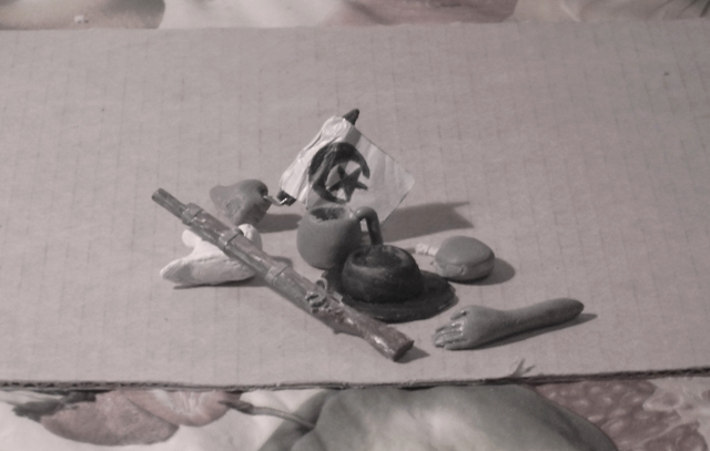 Представляю кисти рук и жалонерский флажок(теперь уже не нужные),а так же предметы снаряжения:сухарную/вещевую сумку,большую кружку(называемую у НИХ почему-то котелком(?)),флягу, шляпу и ружьё(тоже побывавшее в зубах собаки и его тоже придётся переделывать(какой-то по счёту раз и всё по той же причине, рок какой-то!). Фляга и кружка/котелок ещё будут подтачиваться.