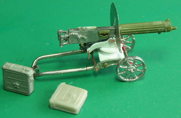В запасе у меня было две модели пулемётов Максим, фирмы Звезда и из белого металл из Пензы. Ни один из них не ставился на станок. Ширина хода была великовата. ну и по мелочам. Проверил всё по чертежам и из деталей двух моделей, и частично сделанныз заново сделал свой Максим.С подвижными деталями. Сделал мастер модель пулемётной коробки и отформовал 12 шт.