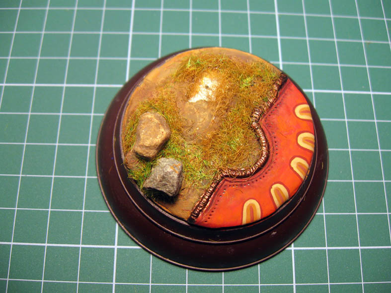 Нда... Скорее всего надо было всё таки делать его отдельным куском, дождаться когда застынет эпоксилин,а потом как -то соединить с подставкой- что бы была значительная щель, что бы глаз видел что это посторонний предмет на траве...