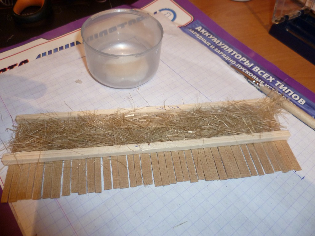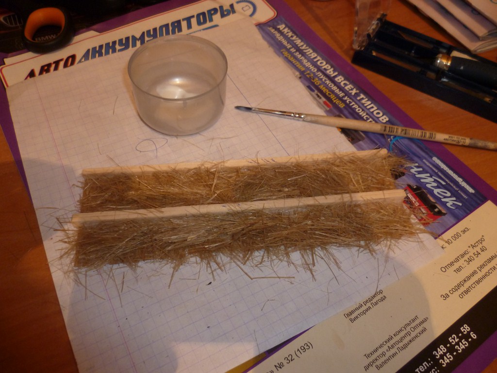 сделал потолок комнаты,имитация сена сделана из пакли,поверх дранки позже нанесу шпатлевку и пооткалываю в некоторых местах,в дом пока вставил для примерки,приклеивать буду позже