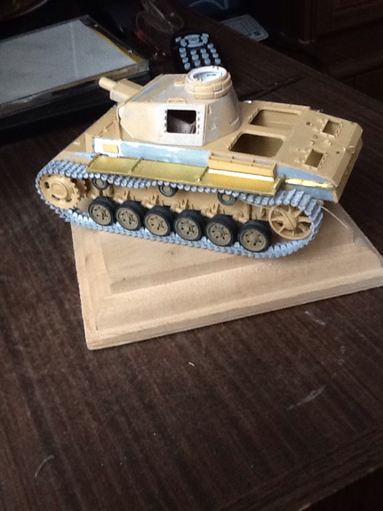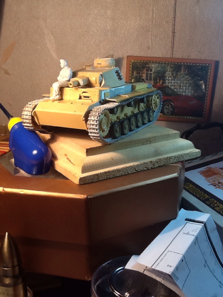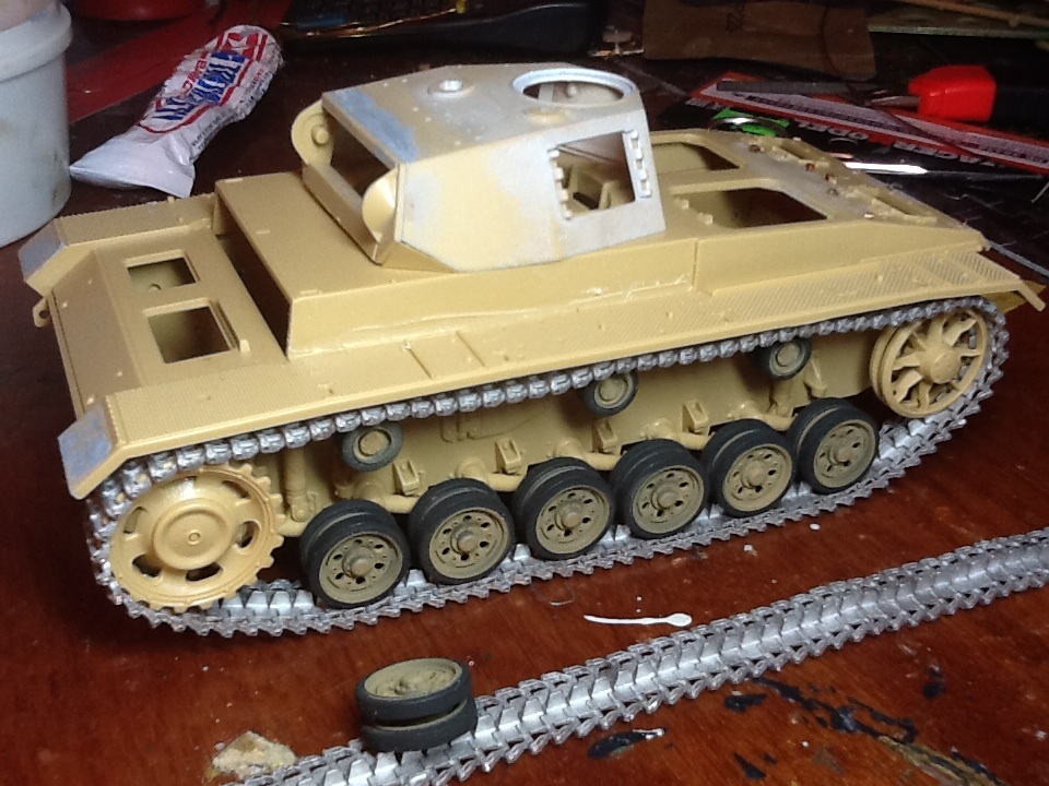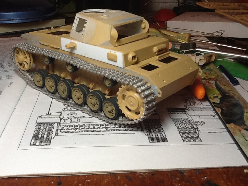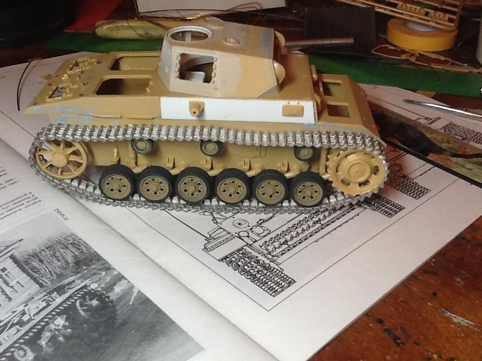 Прошу прощения за плохую фотографию (за неимением фотоаппарата сегодня вынужден был снимать на телефон). В общем виде хотел показать проделанную за несколько дней работу. Заранее собраны и окрашены катки. Для бандажей использовал тамиевский nato black ( на мой взгляд он хорошо передает цвет резины), желто-оливковый накрашен через трафарет. Так же собраны ленты гусениц (довольно нудная работа). Крепление тросов сделаны из листовой меди.