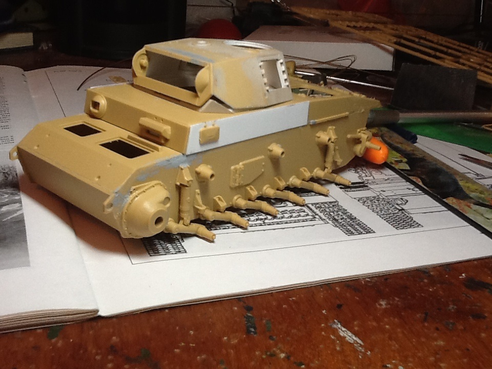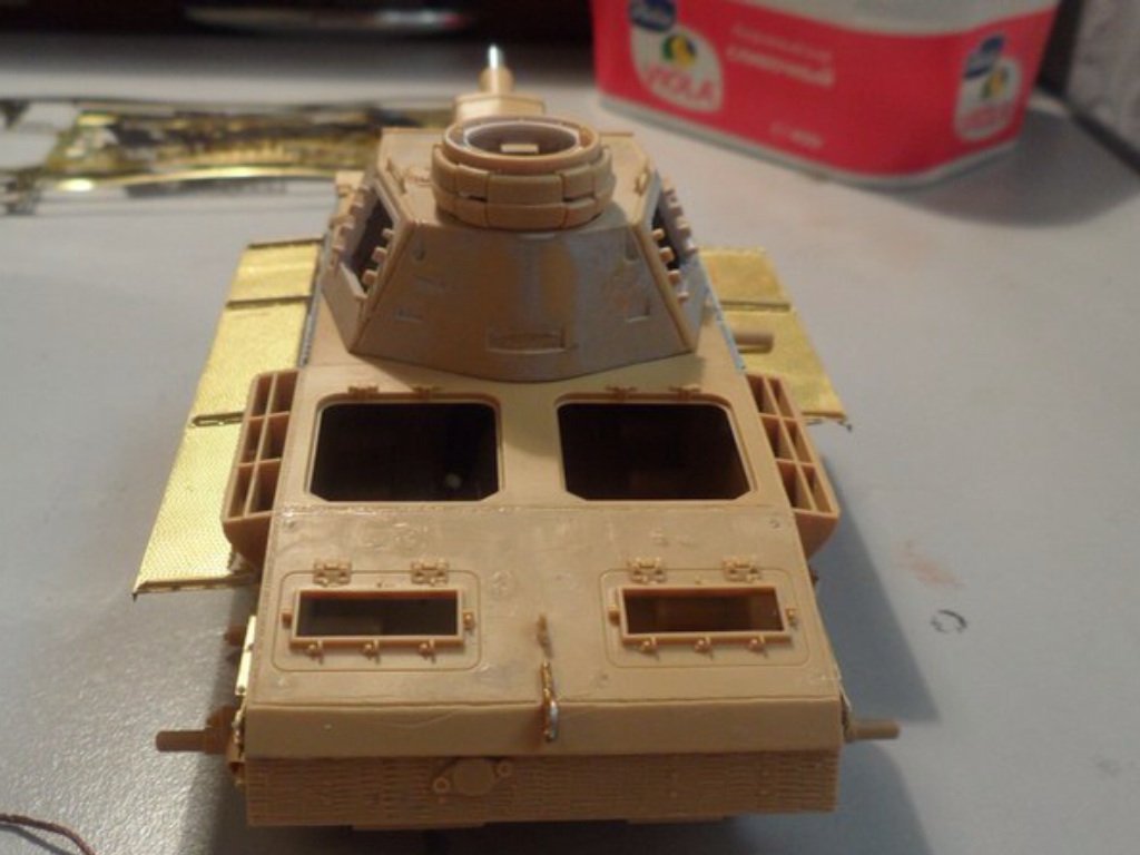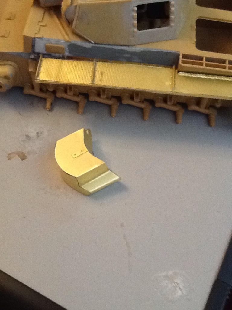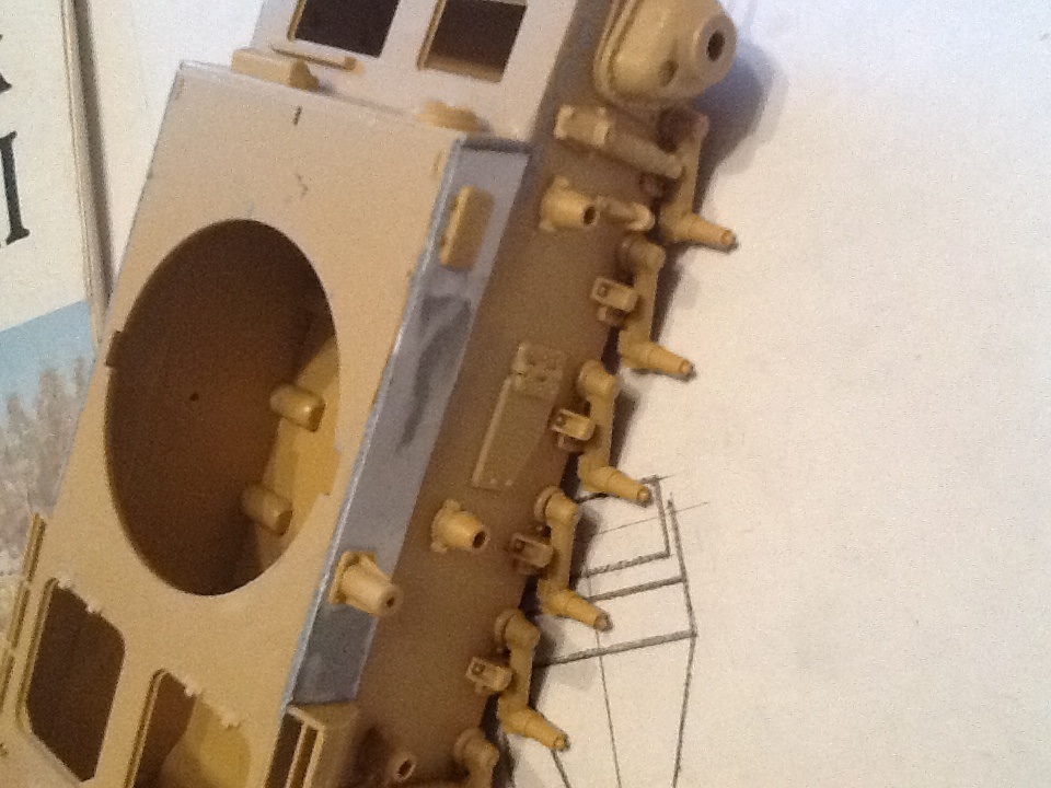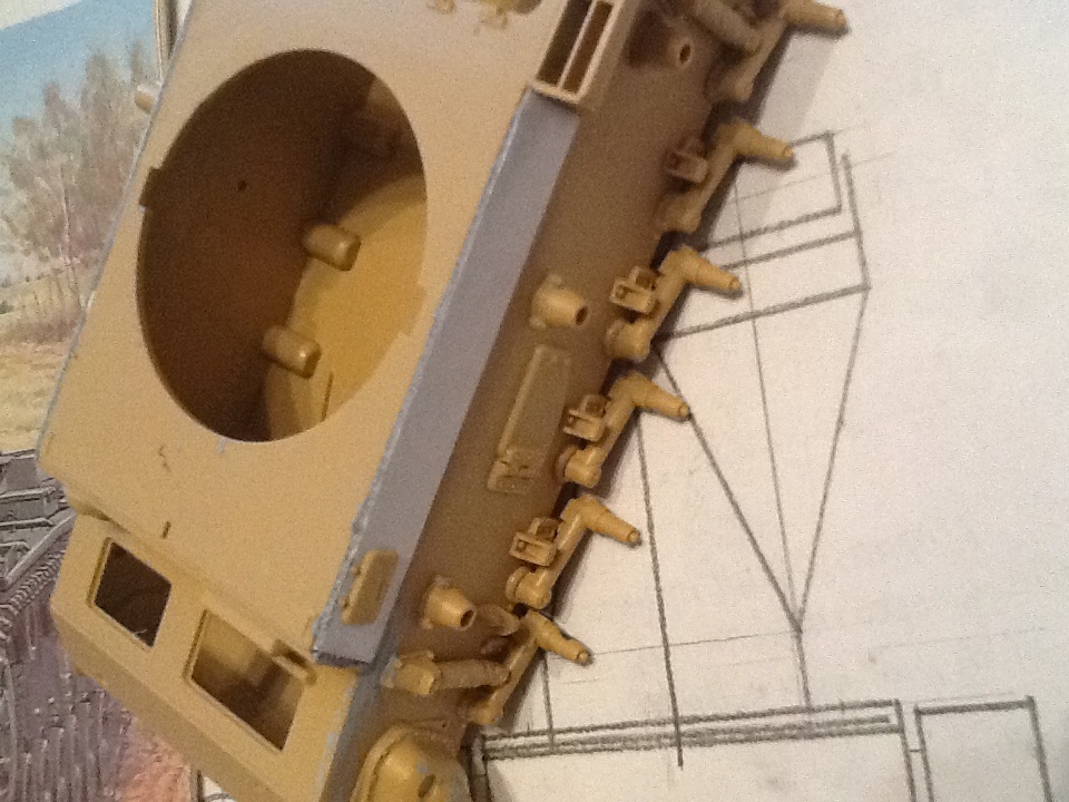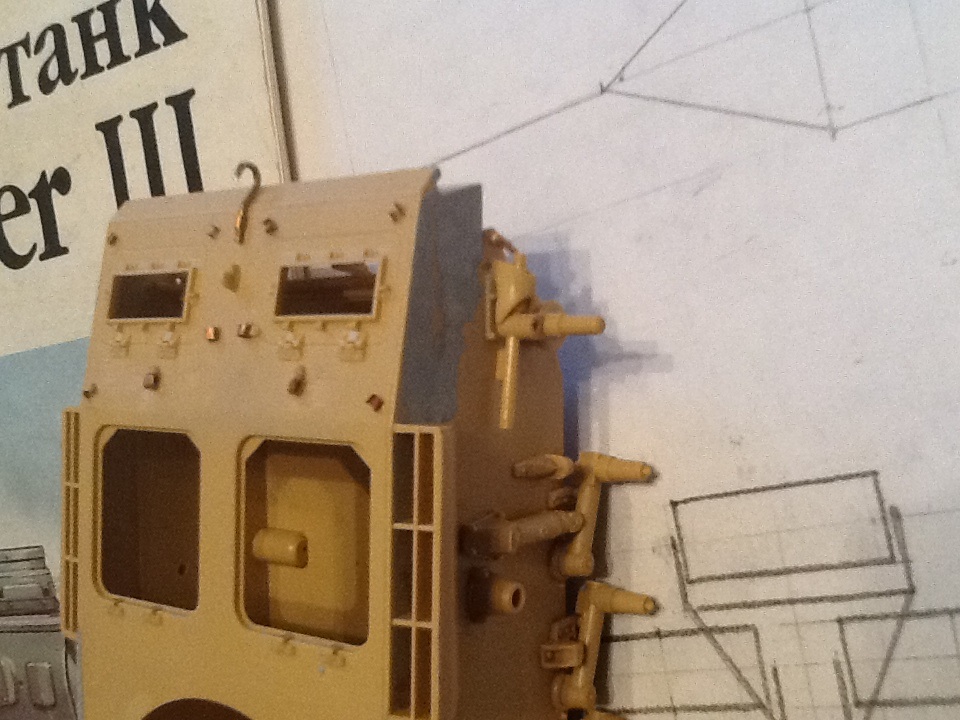 STEINER, да ничего страшного. Сейчас корпус уже склеен с ванной. До стадии имитации сварных швов еще не дошел (надо для удобства собрать башню и некоторые элементы корпуса). В наборе детали боковинок даны толстыми и сильно выпирали. С этих деталей взял люки, болтики и антенный вход. Про провис не знаю(на документальных фото вроде так), да и как делать кроме как приклеить подвижные гусеницы к каткам.