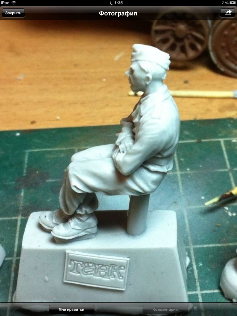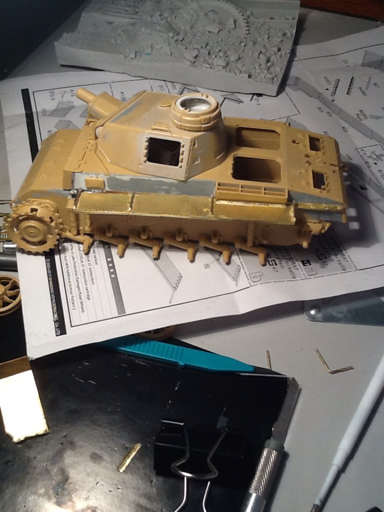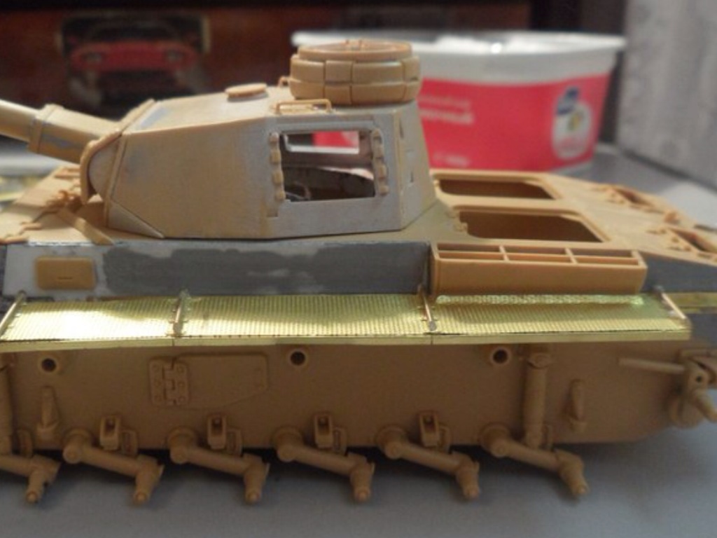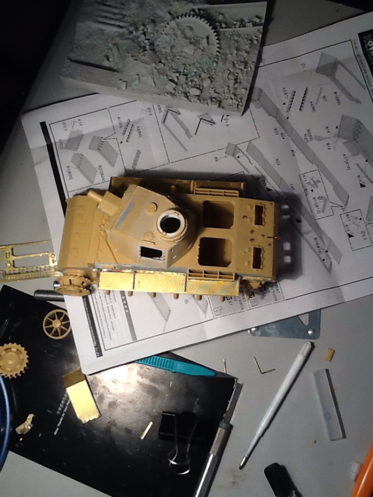 Прошу прощения, долго не выкладывался из-за ряда причин... За последние две недели доделал надгусеничные полки (травление воягер), расклеил головки болтов, которые срезал со звездовской "тройки". Пришлось менять расположение боковых лючков (на фото, я заметил, они не симметрично расположены). Сегодня начал делать забашенный ящик(травление абер). Остаются сварные швы (канавки под них прорезаны) и крепеж шанцевого инструмента (травлёнка). Планируется делать маленькую виньетку (нужно выбрать одну из фигур)... Можно будет красить. За фото извиняюсь...