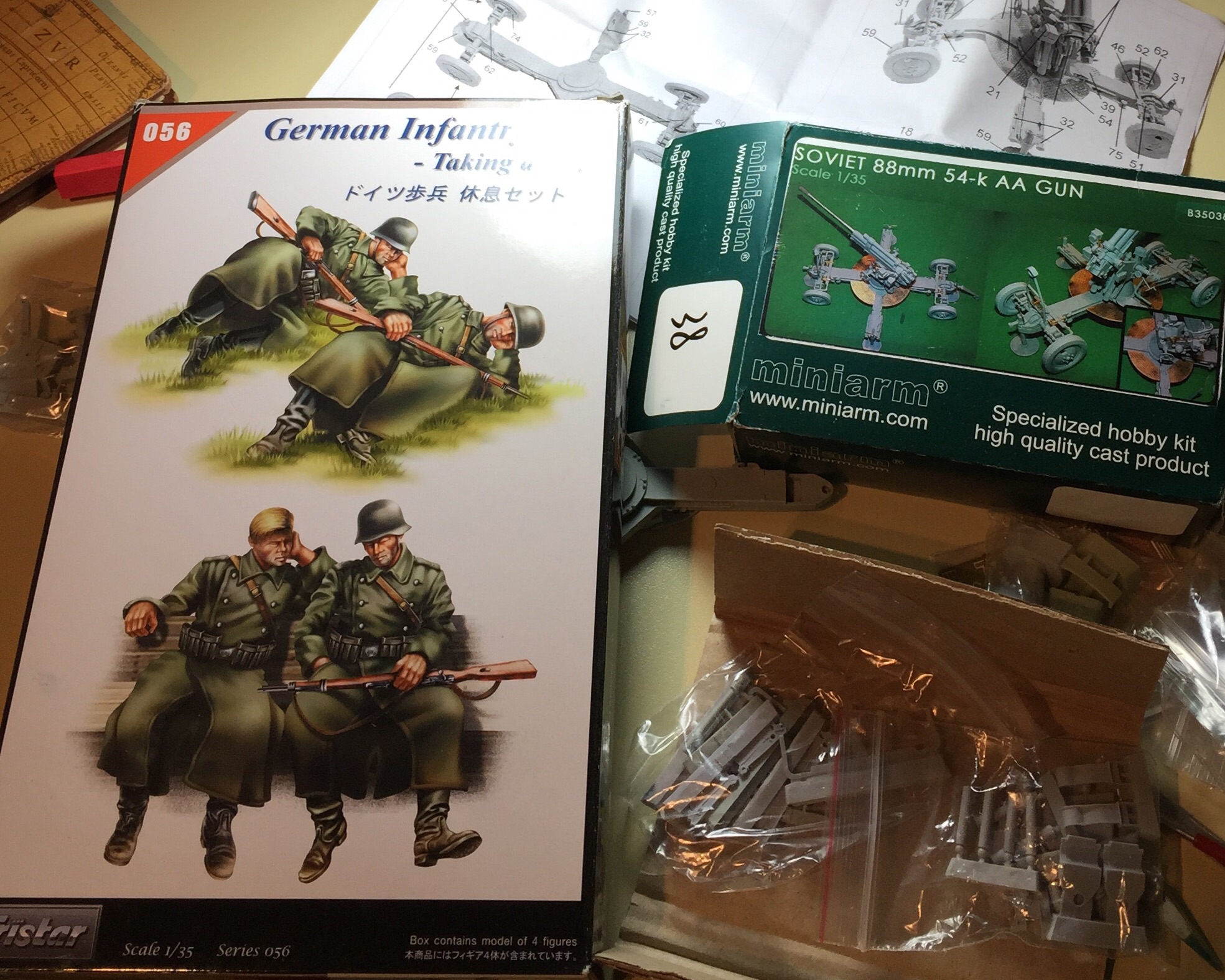 Материал, для будущей диорамы, так сказать "по мотивам.." Из спящих немцев будут созданны два наших убитых бойца, на роль третьего, пока ищу фигурку.. Скорее всего это будет сидящий боец из миниартовских артеллеристов. С размером подставки пока не определился- сделаю лафет орудия , прикину размеры основания..