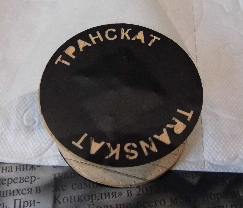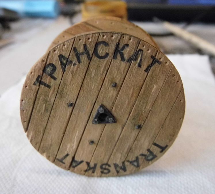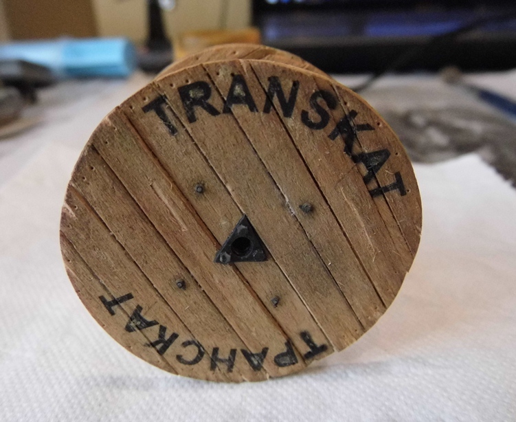 По сюжету команда монтеров готовиться к замене контактного провода. На платформе будет находиться станок с катушкой с контактным проводом. Боковины катушки изготовил из склеяного шпона. Сам барабан из соломки.Трафарет заказывал в рекламном агенстве. Диаметр катушки 43мм. Наклеил трафарет. Аэрограф, черный акрил от Тамии...