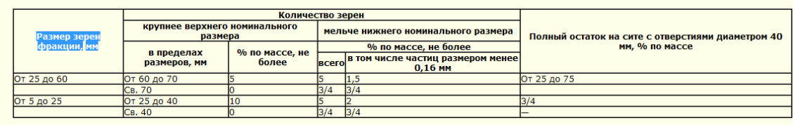 На заводах, работающих на базе гравийно-валунных месторождений с содержанием в горной массе крупных фракций, не обеспечивающем необходимое количество дробленых зерен в щебне, допускается выпускать щебень с зернами размером от 5 до 40 мм, при этом количество в таком щебне зерен размером от 40 до 70 мм не должно превышать 5 % общей массы щебня, а зерен размером менее 5 мм — не более 5 % общей массы, в том числе частиц размером менее 0,16 мм — не более 2 %.