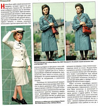 Решил выложить скан японского моделиста для будущего сравнения и обсуждения.Кукольность причесок всегда была спорным вопросом.Мне,например,очень нравятся работы некоторых мастеров в шестом масштабе именно из-за причесок,копийности ткани,кожи,металла.У японца,на мой взгляд,слишком одноформатные прилизаные персонажи,чувствуется японская аккуратность во всем.Даже у мужика ровная мягкая шевелюра.Я старался сделать своей амазонке свободную воздушную прическу,сооветствующую ее романтическому образу,чтобы они не стояли колом,а как бы, обволакивали ее прекрасные формы.Фотки уже завтра.