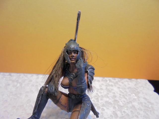 Выкладываю фото с волосами.Пока только в анфас,так как фигурка снята с зубочистки и будет сегодня устанавливаться.По другому не держится.После установки еще будут добавляться локоны,подкрашиваться и причесываться,создавая обьем.Опишу технологию.Заранее обошел все местные хозяйственные и косметические магазины,накупил много разных кисточек.В основном использовал такие распушенные для визажистов.Сначала просверлил отверстия в шлеме,подобрал два отрезка проволоки небольшой длины и облепил небольшим количеством милипута.Почти сразу небольшими пучками со всех сторон стал приминать к милипуту.Да,проволоку я сразу постарался изогнуть по рельефу плеч и на конце оставил 2мм,чтобы после вставить в плотную в отверстия.Выждал три часа пока все схватится,но каркас пластичен.Начал аккуратно отрезать и формировать небольшие пучки разной длины,мазать концы кисточкой с клеем супер ПВА.Так же осторожно прижимаем к каркасу пинцетом,сразу убирая выступивший клей.Лишние,неправильные волосинки убираем(эта процедура многократная).Часа три даем просохнуть.Потом начал окрас.Мне нравятся брюнетки,поэтому за базу решил оставить натуральный цвет,благо щетинки изначала с переходными тонами.Красил аэром,стараясь высветлять кончики волос иверхние пряди.Кисточкой акрилом не рекомендую,так как клей на водной основе и волосы начинают выпадать.После очередного просушивания аккуратно вклеил косички в шлем на 5-минутный эпоксипол,разглаживая иголкой,чтобы не было резкой ступени.После подклеил мелких волос.Смотрите,критикуйте,удачи!