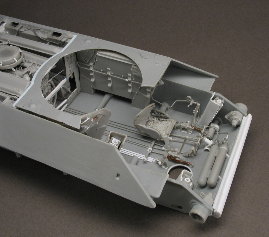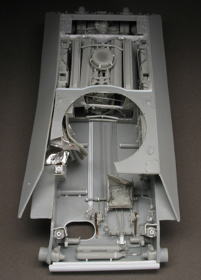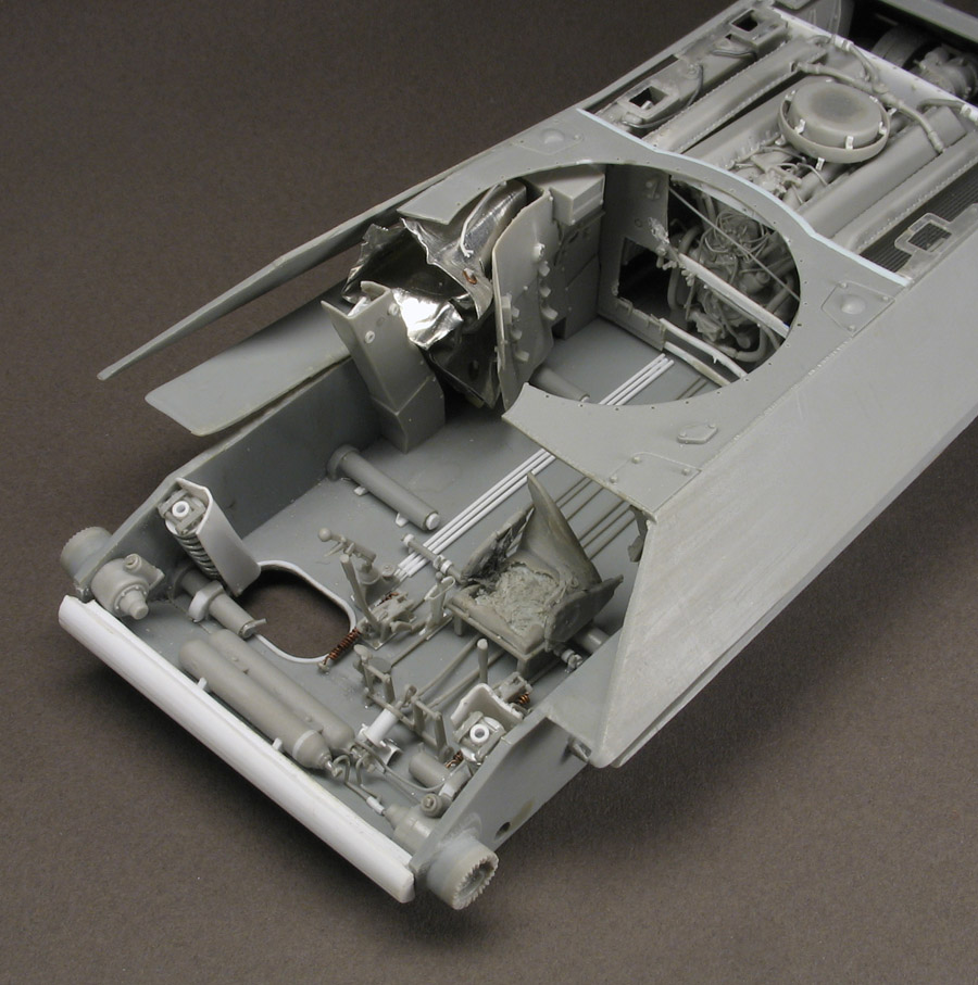 Да тут собственно солянка. Начал с Драгона, когда ещё не было АФВ, потом прикупил АФВ, травло Вояджер ну и руками много чего поделал. Корпус тут от Драгона. АФВшный интерьер годиться только для целого танка, и то только чтобы через открытые люки его наблюдать. Для взорванного танка, как у меня, требуется многое переделать, особенно в боевом отделении.