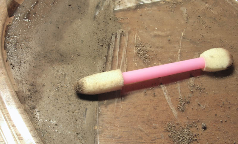 Во-первых, чем наносить? Я купил в отделе косметики пять кисточек-спонжей за 40 руб - по моему самый лучший вариант, лучше чем кисть по крайней мере. Во-вторых раньше я сталкивался с проблемой комочков и избыточного количества пигмента - если насыпать на что-нибудь немного пигментов и брать их кисточкой или спонжем, то часто попадаются комочки, которые на фигурке превращаются в резкий и насыщенный мазок, кроме того так работать не совсем удобно когда нужно взять совсем немного пигмента. И я случайно "нашел" новую "технологию" - нужно рассыпать немного пигмента, смочить (залить) обычной водой его и размазать по некой поверхности (в моем случае это крышечка от пластикового пищевого контейнера). Когда всё это хорошо высохнет, то пигмент как бы будет покрывать поверхность тонким и относительно непрочным слоем, этакой корочкой, отсюда преимущества: