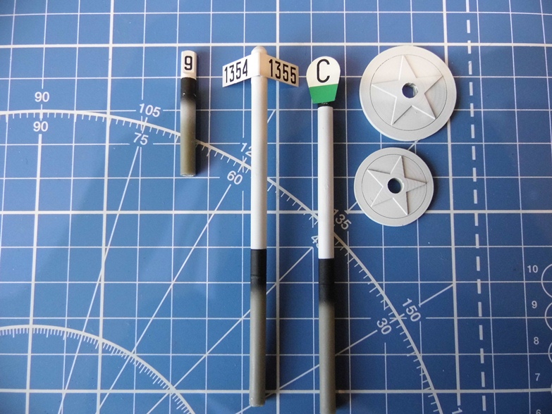 Есть набор, в котором километровый и пикетные столбы, знак "свисток", путевые знаки начала и конца кривой, а так же 2 розетки. В наборе идет пластинка травления и богатая на цифры декаль (которая может пригодиться и в другом), и еще несколько кусков рельс, как альтернатива столбам.