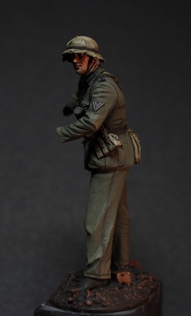 Хотелось бы обратить внимание критиков еще на такой момент. Эта фигура у Михаила далеко не единственная на Харьков. Достаточно полистать этот блог - как минимум это третья фигура. Все остальные в серых касках без белил. То что он разбавил свою серию одной фигурой в беленной каске вполне естественно на мой взгляд. Я бы поступил точно так же, может быть только больше сделал потертостей до серого.
