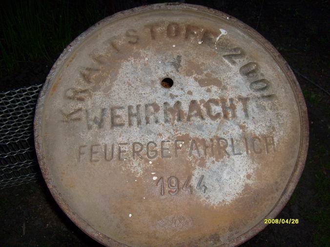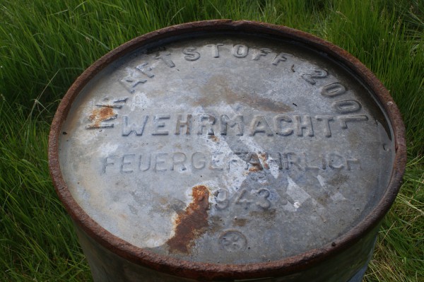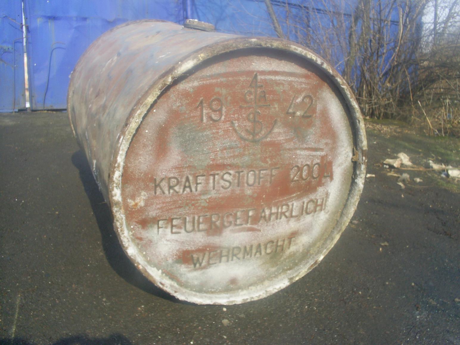 Бочка мятая, возможна с несколькими пулевыми отверстиями- иначе она оказалась бы на складе, полная, а не использованная под военно- фронтовой- стол- тумбочку (немецкая рачительность, знаете ли).