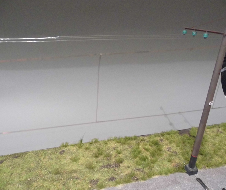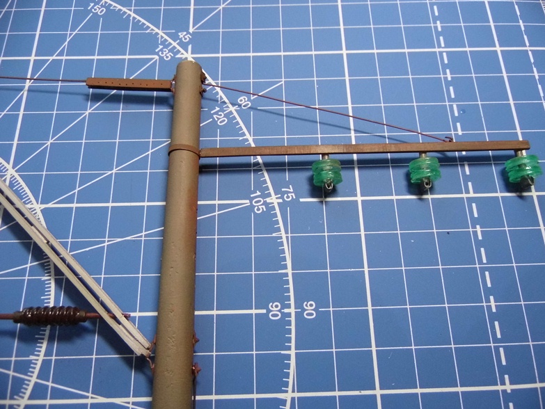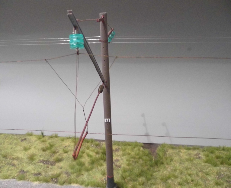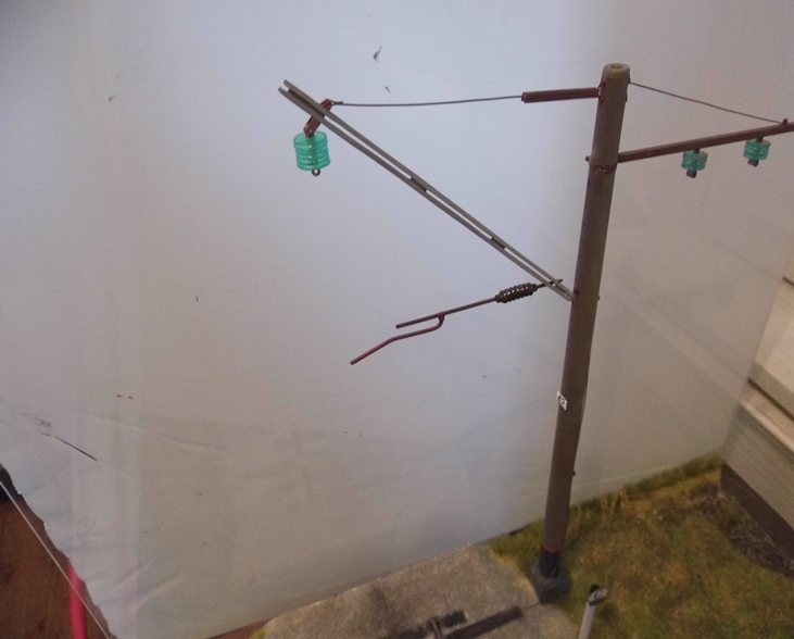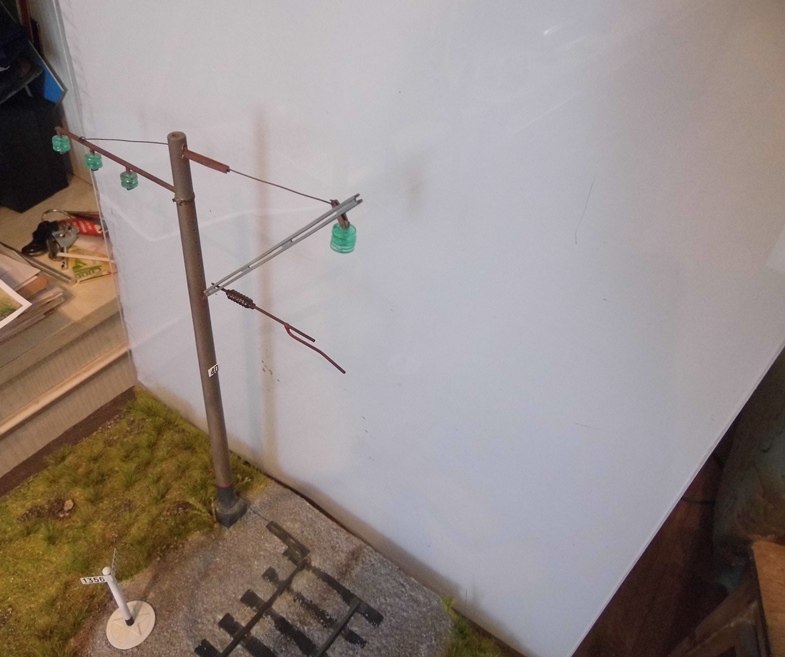 Закончил опоры и установил на диораму. Осталось только контактный провод спаять, покрасить и повесить.