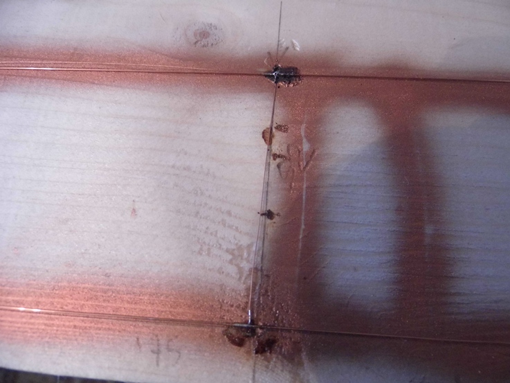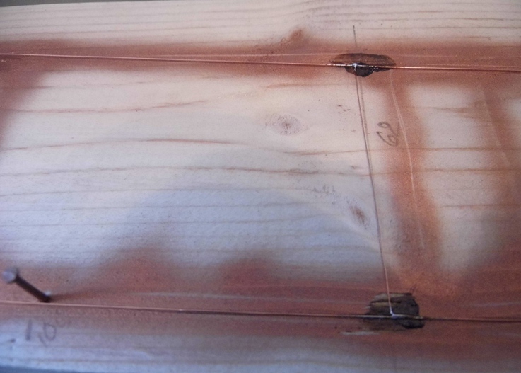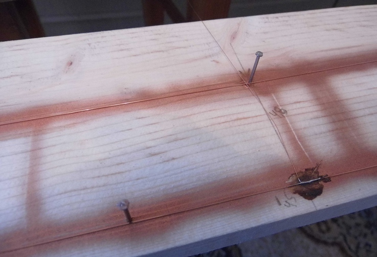 Контактный провод паял. Предварительно по контуру забил посылочных гвоздей... Проволока для несущего троса (верхний) 0,35, а сам контактный провод - 0,3.