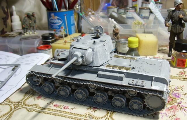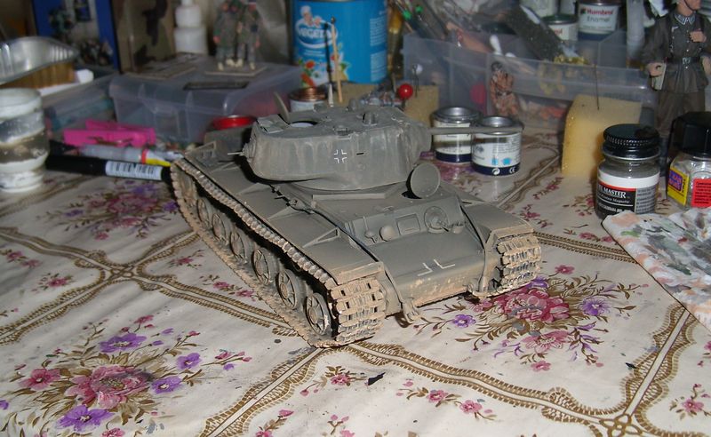 Понемаю Вашу проблему! Хотя сложного здесь нету когда собраны и котки и гусянки одеты! Вот мой КВ-1 Красился полностью.,когда модель была ПОЛНОСТЬЮ собрана вместе с траками =) Кто-то говорил мне что..но будет не удобно красить траки..(не хочу этого человека огарчать) но всё собрано было..,и окрасил.