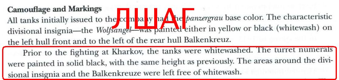 Еще один аргумент в пользу того, что Тигры этого периода не красились на заводе в белый цвет – это Тигры «ЛШАГ». Там ИМХО такая ситуация. Во время подготовки л/с к отправке на фронт, Тигры были промаркированы (номера, эмблема, кресты) белой краской. А когда пришло время оправляться на фронт и красить танки в белый цвет, то не стали утруждать себя и места нанесения маркировки не стали окрашивать в белый, это хорошо видно на фото Тигров батальона. http://www.tiif.de/thread.php?threadid=48&sid=