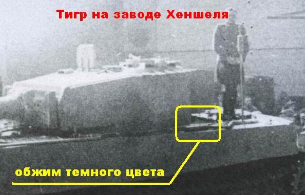 Я уверен, что на фото, Тигр 801 как раз сразу после покраски. Ни в одном месте былый цвет не заляпан. А если бы он ехал в таком виде под навес, то катки не были бы такими чистыми. Более того, можно увидеть случайно окрашенные в белый, бандажи катков, это так же говорит в пользу того, что это свежепокрашенный танк.