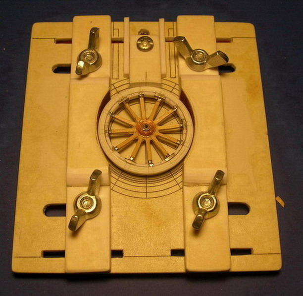 Немного отвлёкся на изготовление виньетки. Но добавил немного. Поставил в гнездо подъёмный механизм. На связующие попреречные "болты" надел тонкостенные трубки. Они служат ограничителями по ширине при сборке станин. Забыл ранее написать. Латунная изогнутая штуковина над подножкой, это подушка, на которую укладывается казённая часть орудия в походном положении.