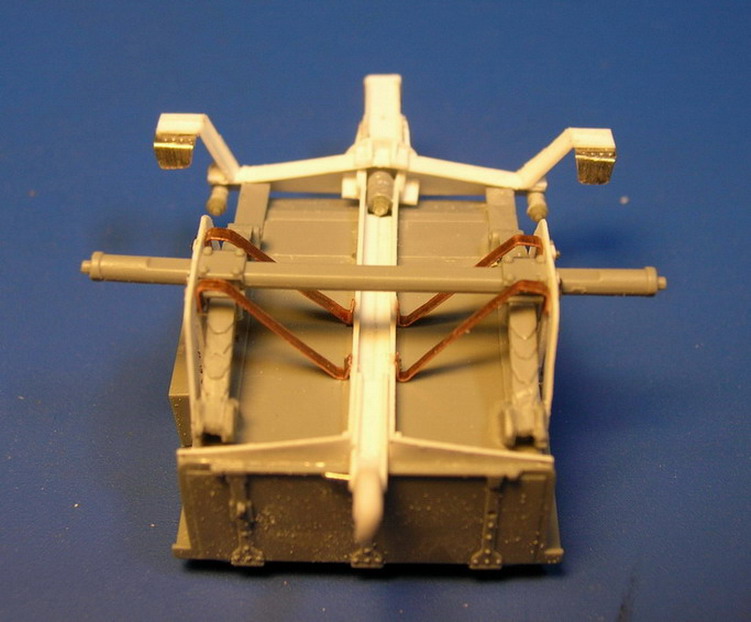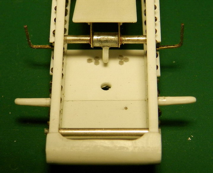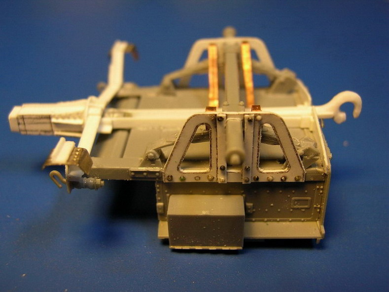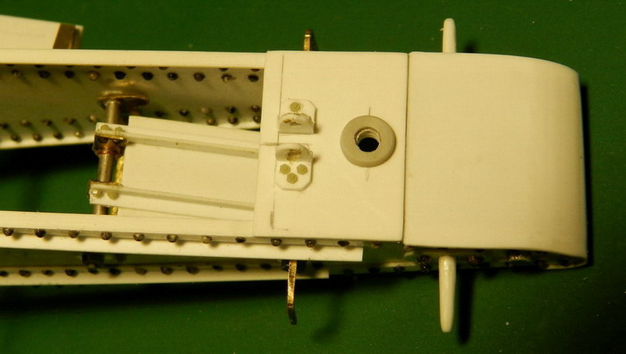Я же сделал и установил боевую ось с креплениями. Ближе к хоботу приклеил снизу лист металла с кольцои для шворня передка. Кроме того там закреплены две проушины для установки гидралического компрессора (тормоза отката). Он ставился на орудия размещаемые на деревянных платформах. У меня же они будут только напоминать о подобной возможности. Ибо буду делать орудие с башмачными поясами на колёсах на 1914 г.