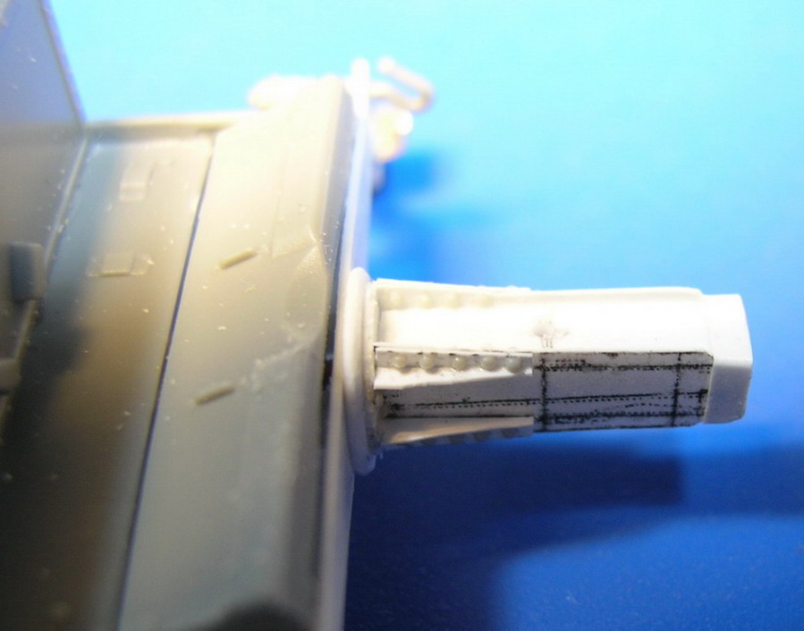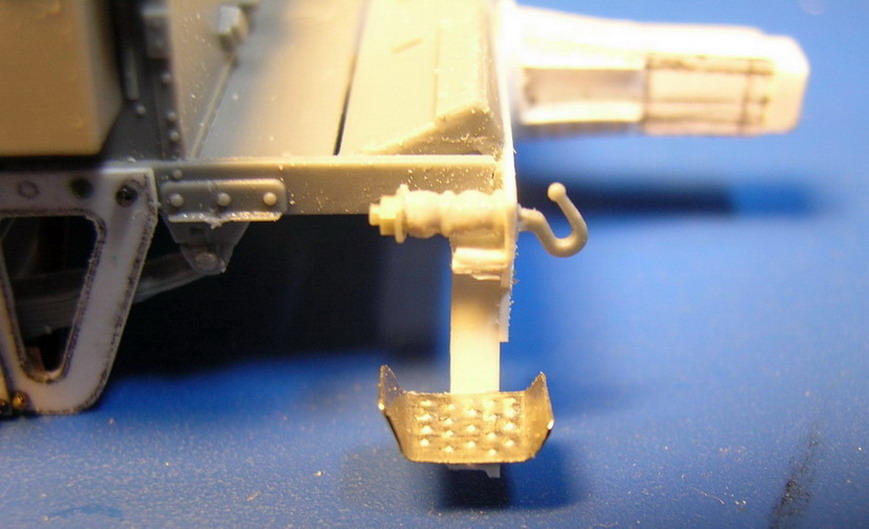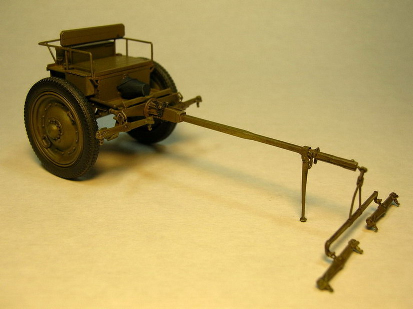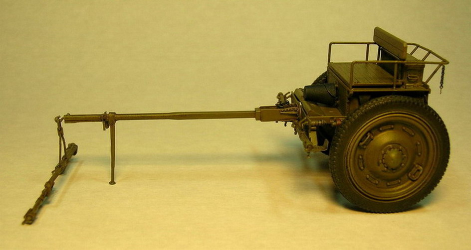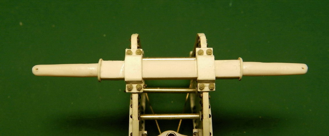 Двигаемся дальше. Соединил две плоскости лафета. С левой стороны прикрепил ещё одну подножку. Это опять более позднее приспособление. На ранних лафетах такого не было. На внешних сторонах станин приклеил головки болтов и гайки, кольца, ручки , в общем всякую мелочь. На хоботе приклеил из полистирола толщиной 0,25 мм. полосу "железа" дополнительно скрепляющую станины.