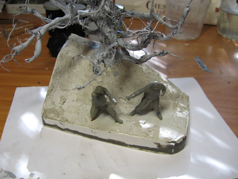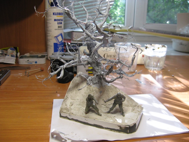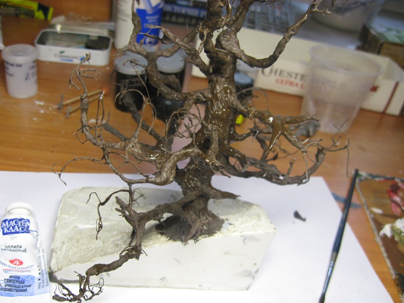 нанес базовый слой,краска еще не высохла,по этому кое где краска блестит.Сейчас довырезаю листья,и буду докрашивать дерево.Смывка,тонировка,сухая кисть и т.д....