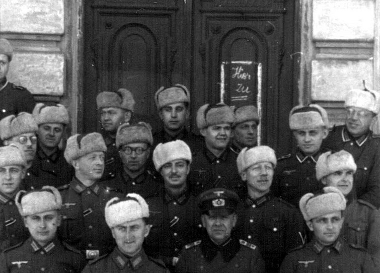 На втором - или все ушанки советские трофейные комсоставовские суконные на светлой овчине, или, по крайней мере, сшитые точно по нашему образцу - с круглым донцем.