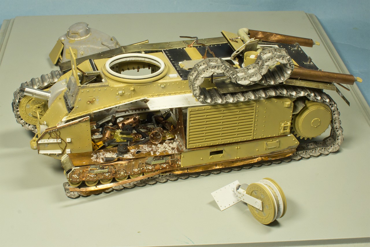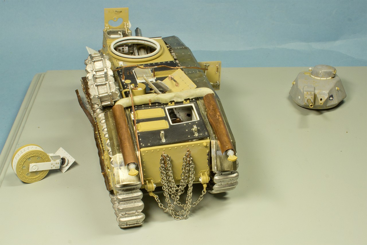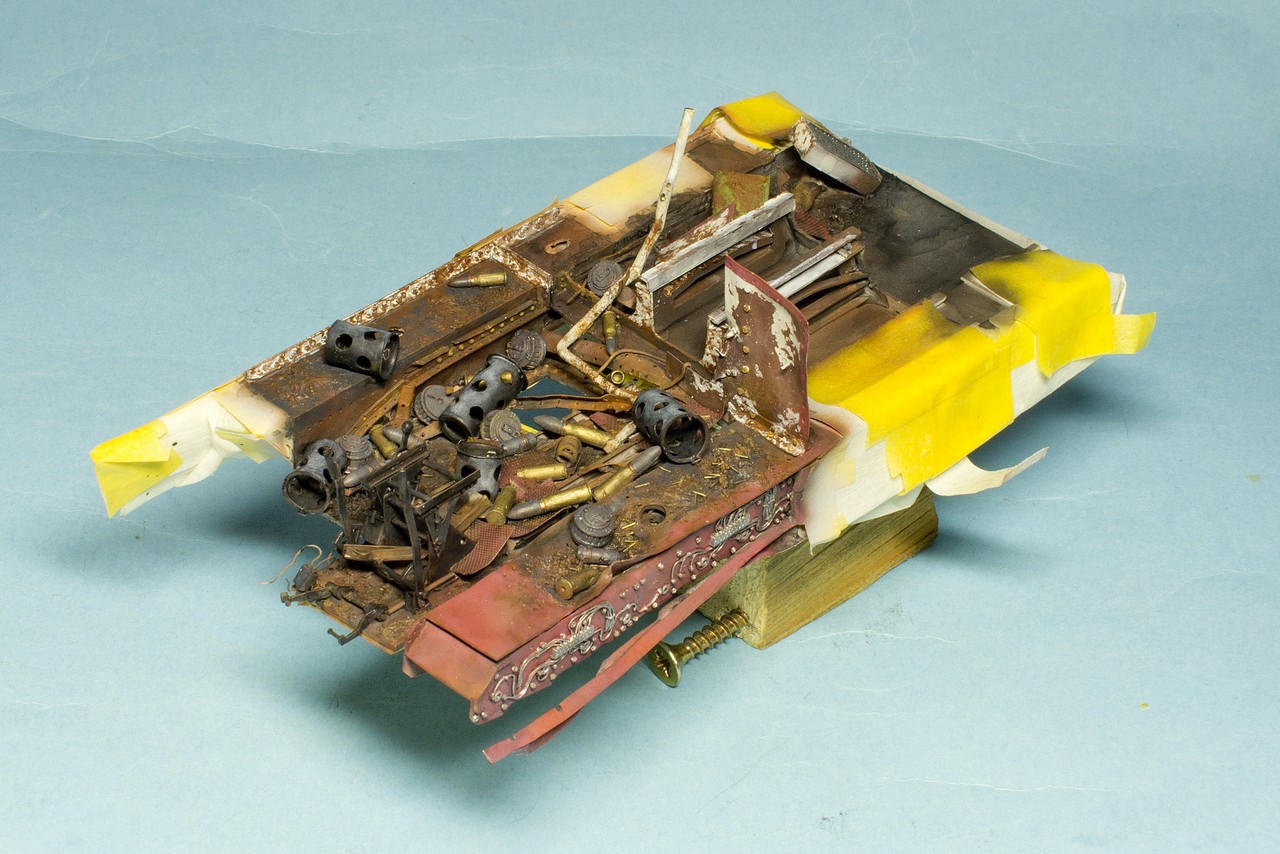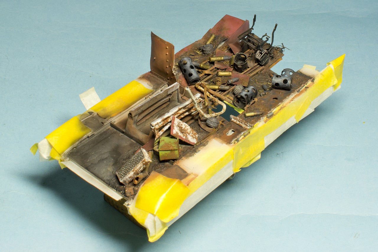 Давно слежу за вашим блогом и с большим уважением отношусь к вашему титаническому труду.К интерьеру испытывал те же чувства.Были мысли разрезать поперек как бы автогеном с оплавившимися,покрасневшими краями и красить интерьер по полной.Но перешел на фигуры,поэтому задвинул идею в стол.Могу посоветовать посмотреть журнал М.Джиминеса"Стили".Там есть шедевральная диорама с разбитым танком ТСМ-2С.Может вам замахнуться на,так сказать,...?Удачи в нелегком труде!
